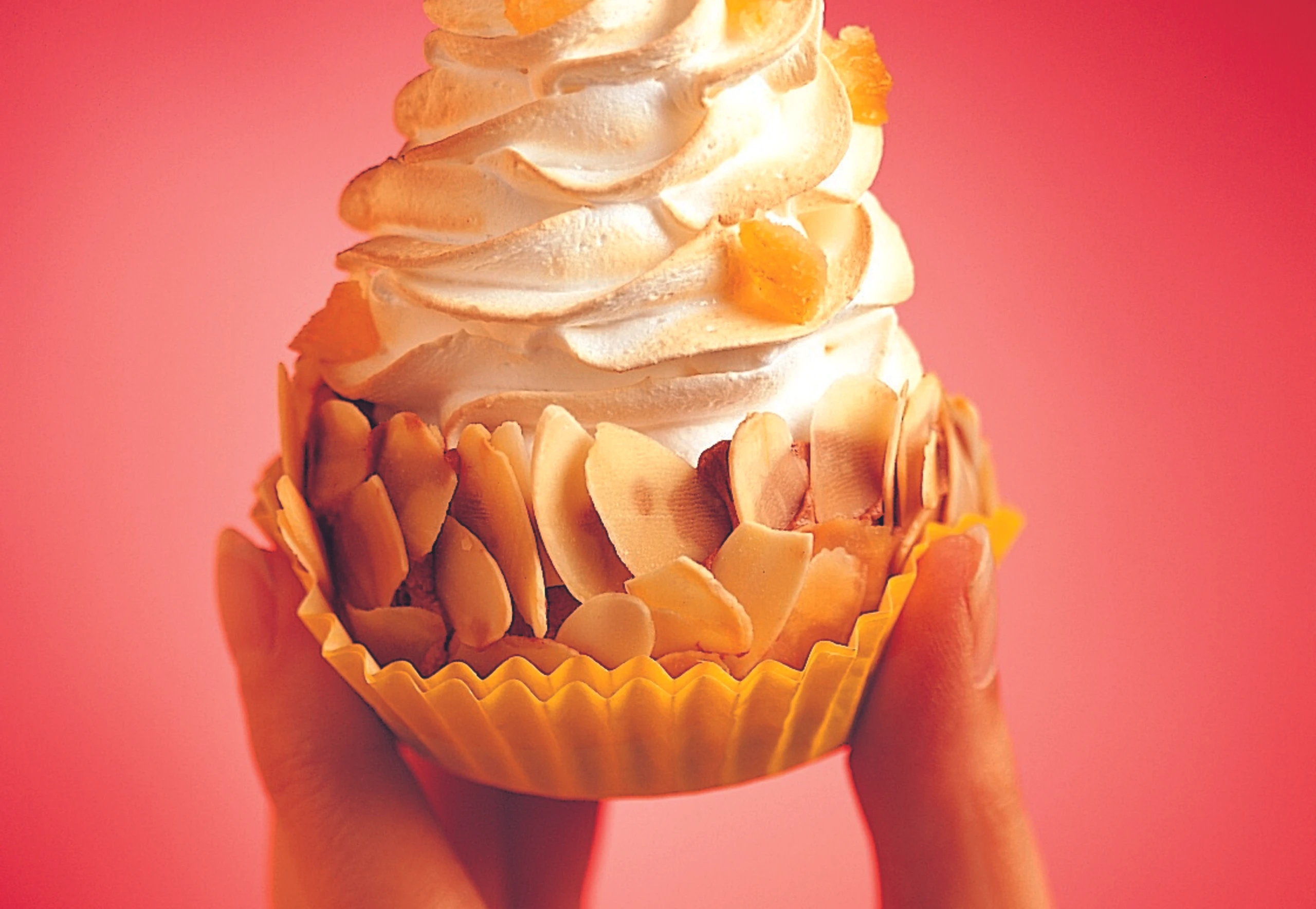Für das Schneehäubchen Eiklar mit 20 g Kristallzucker aufschlagen. Restlichen Kristallzucker (100 g) und Wasser aufkochen (ca. 120 °C), langsam in die Schneemasse einlaufen lassen und weiterschlagen, bis die Masse abgekühlt ist.