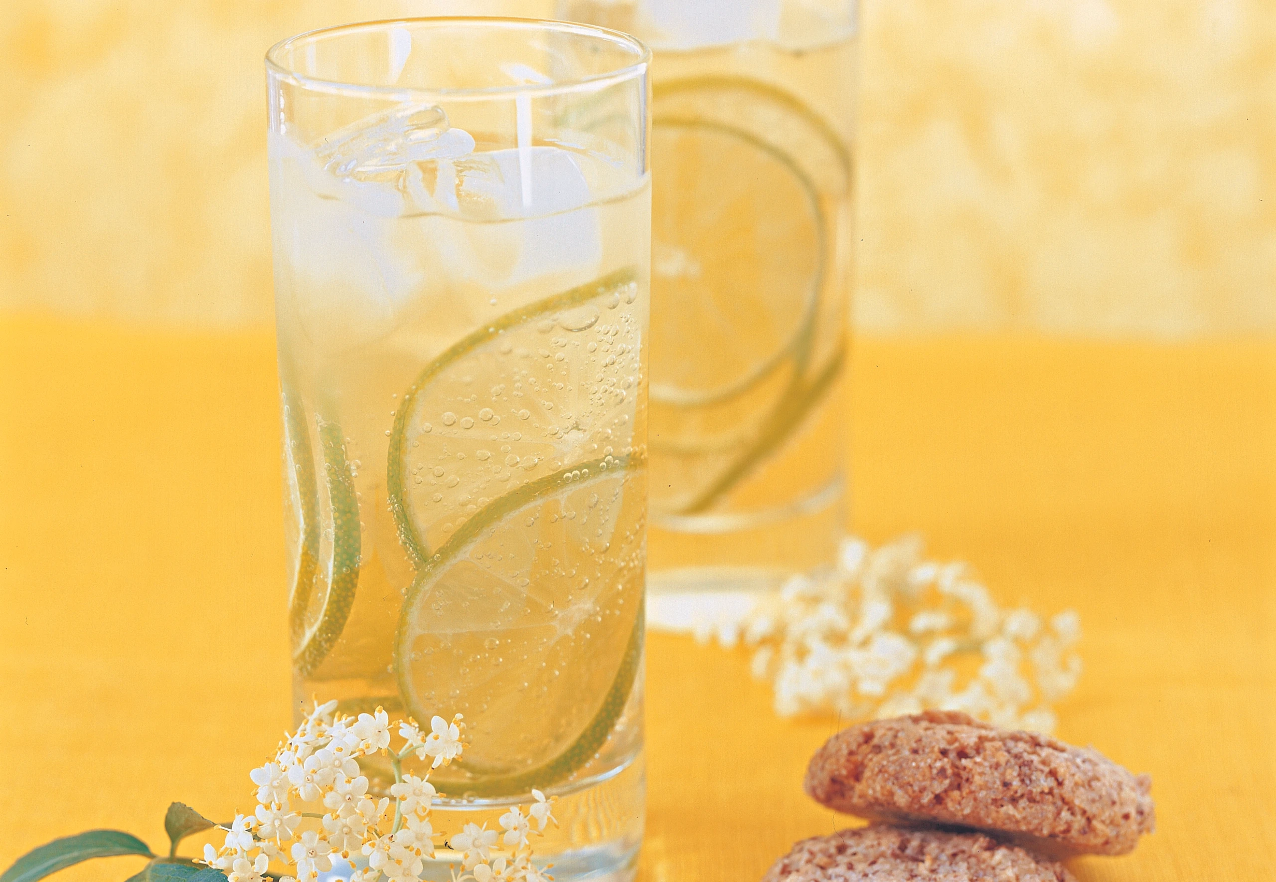 Sirup und Limetten in Gläsern verteilen, Eiswürfel darauf geben und mit Sekt auffüllen.
