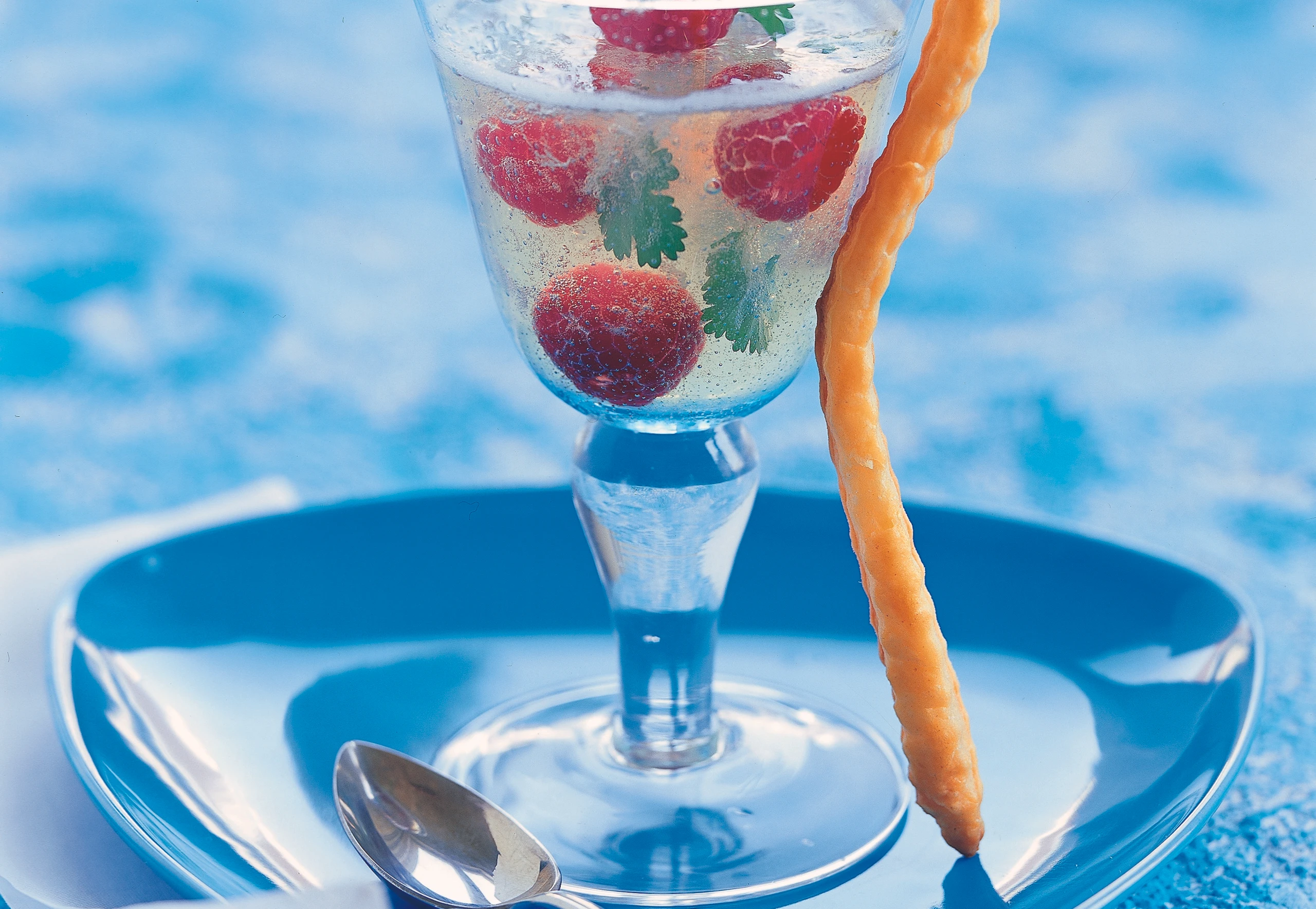 Gläser (ca. 180 ml) kühl stellen. Gelatine in kaltem Wasser einweichen. Holunderblütensaft erhitzen, Gelatine ausdrücken und darin auflösen. Mischung auskühlen, aber nicht fest werden lassen. Himbeeren verlesen.
