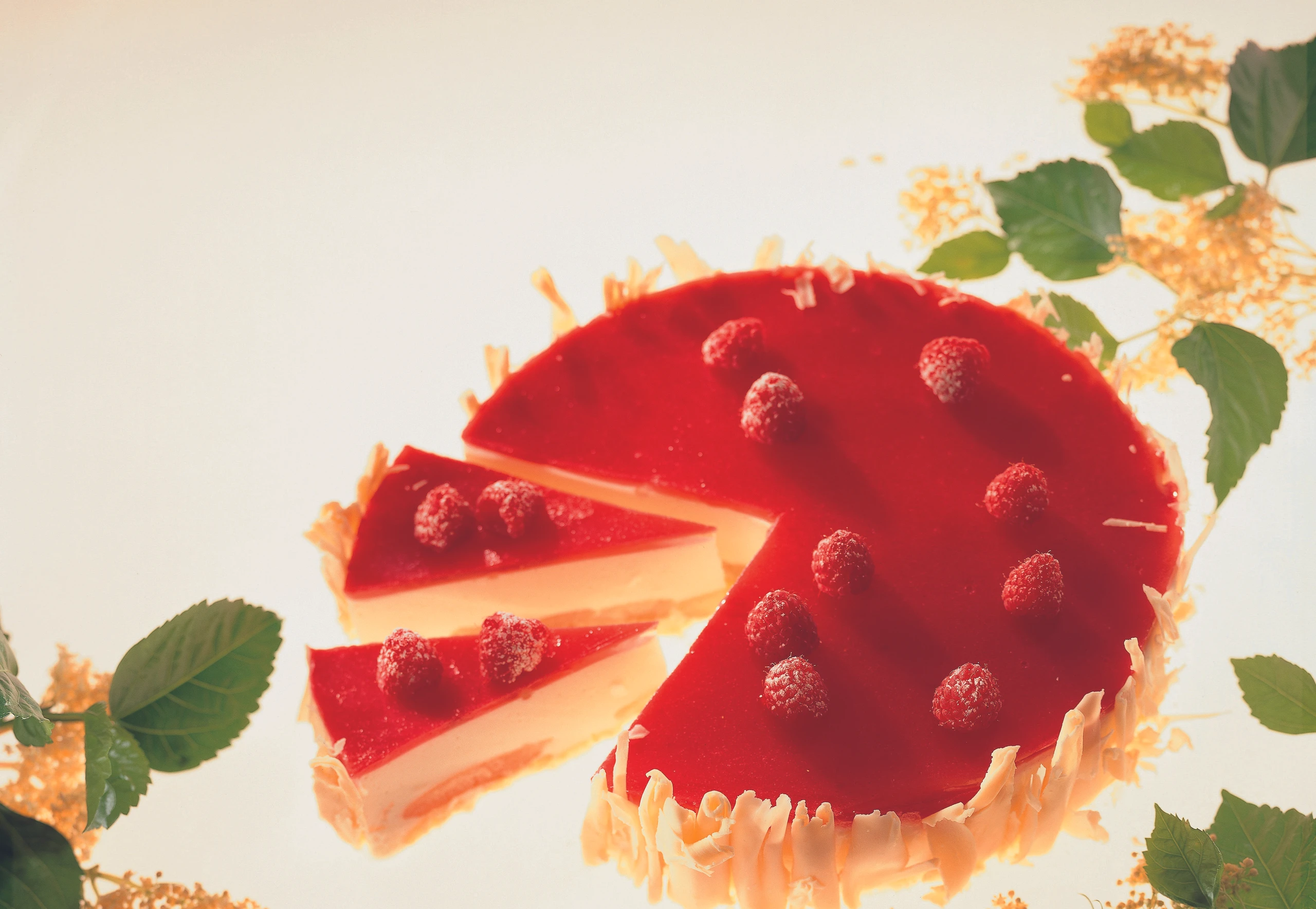 Von der weißen Schokolade mit einem Messer große Späne schaben. Die Torte behutsam aus der Form lösen, rundum mit Schokoladespänen und auf der Oberfläche mit Himbeeren garnieren.