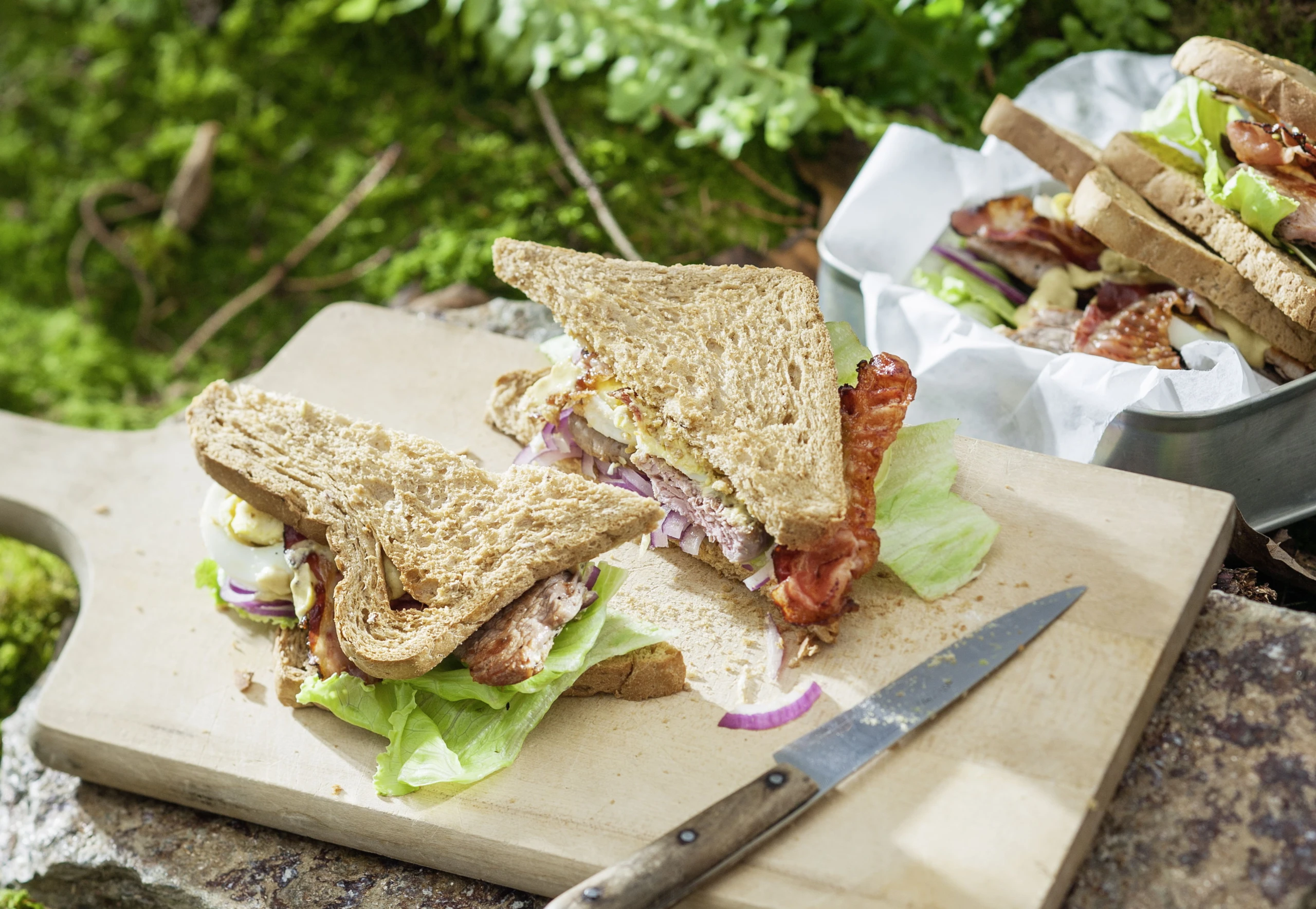 - Brote toasten, 4 davon dünn mit Senf bestreichen, mit Salatblättern und Zwiebelringen belegen. Fleisch, Speck- und Eischeiben darauf verteilen, mit den übrigen Toastscheiben bedecken. Toasts behutsam andrücken. Tipp: Für den Transport einzeln in Frischhaltefolie wickeln.