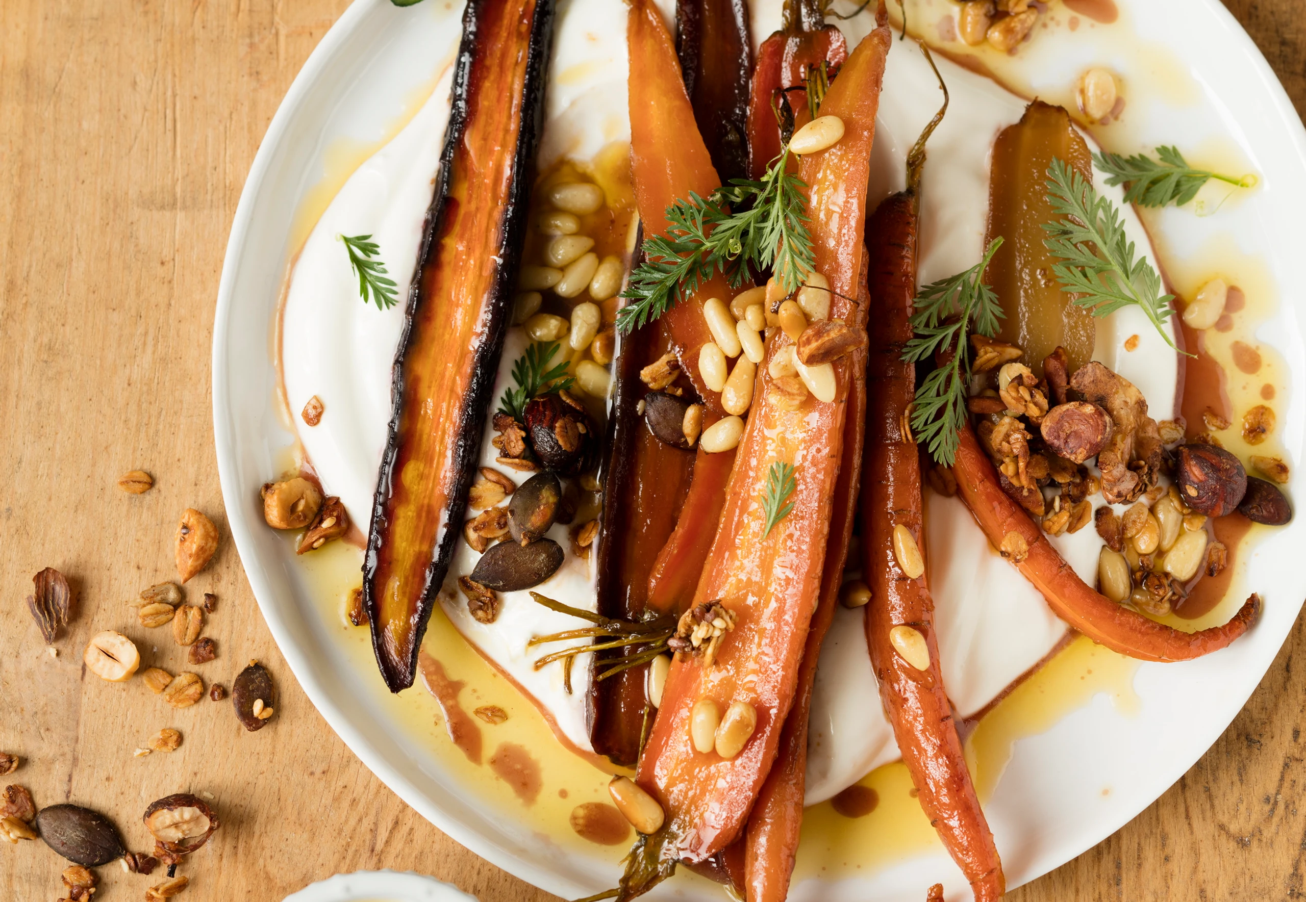Honig-Karotten mit Pignoli, Joghurt und Müsli