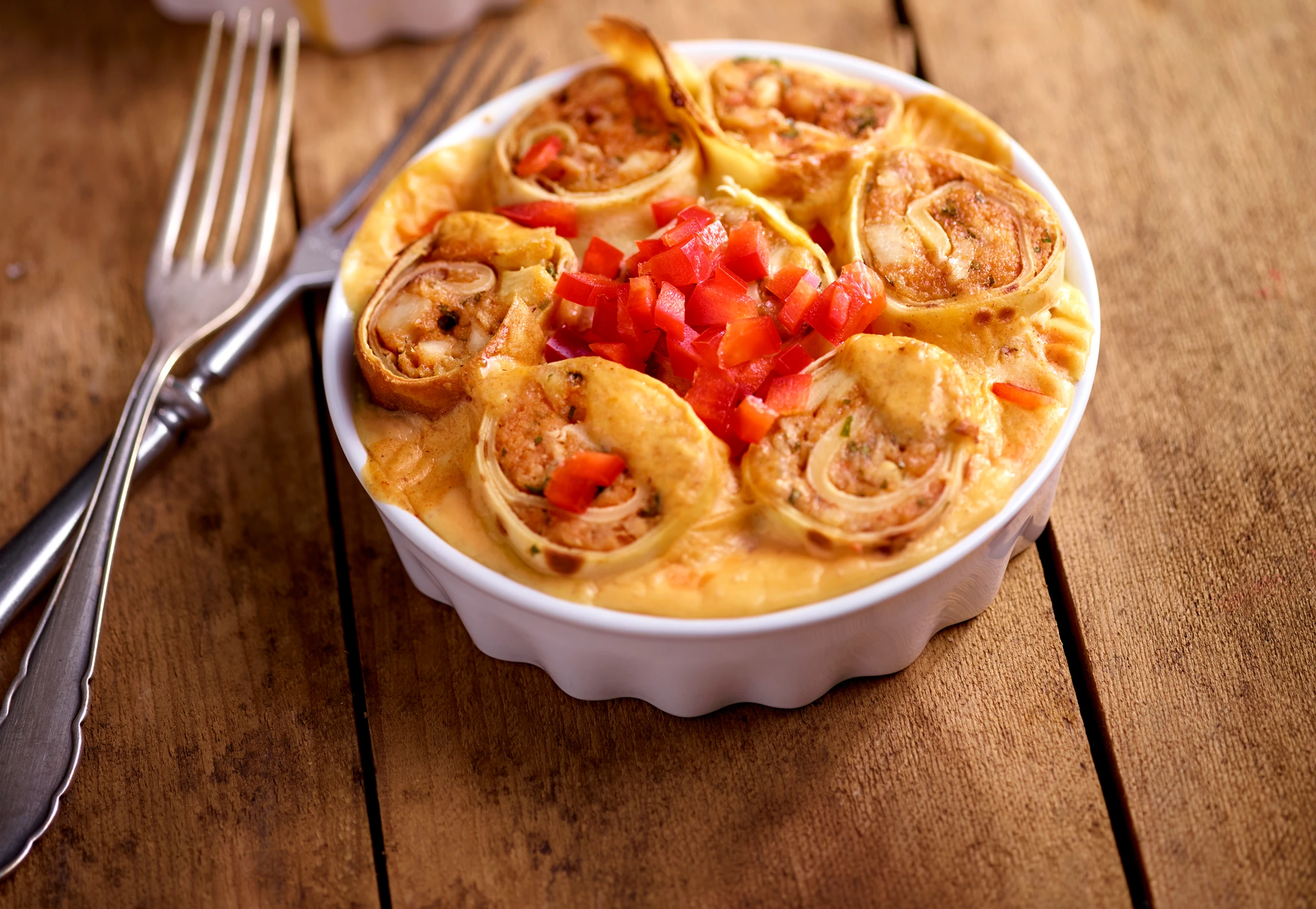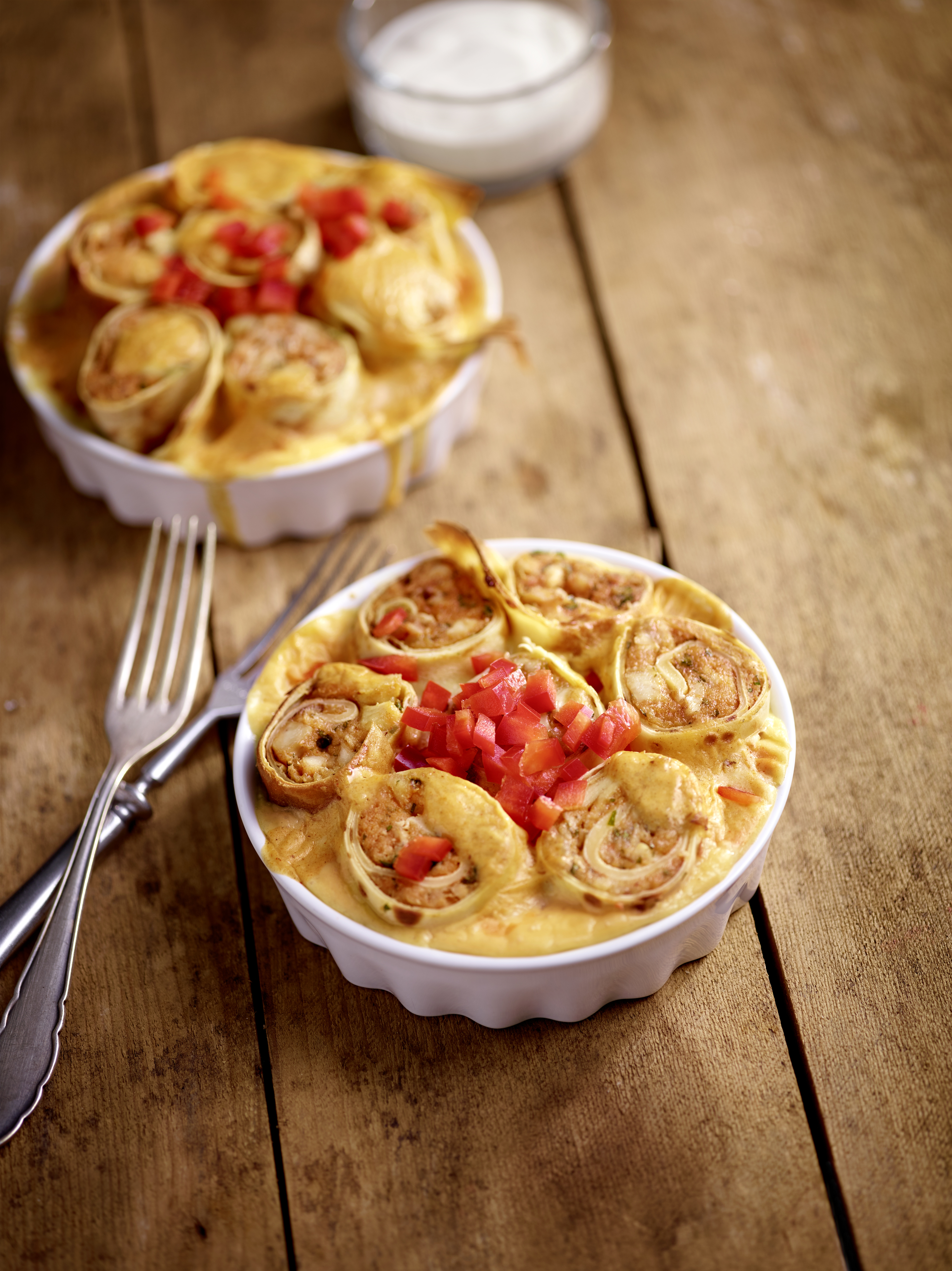 Rohr auf 180°C vorheizen. 4 Auflaufförmchen (Ø 14 cm) mit Butter ausstreichen. Die Hälfte der Sauce in die Förmchen füllen. Palatschinken füllen, rechts und links ca. 2 cm einschlagen und eng einrollen. Palatschinken vierteln, mit der Schnittfläche nach oben knapp nebeneinander in die Förmchen setzen und mit der übrigen Sauce bedecken.