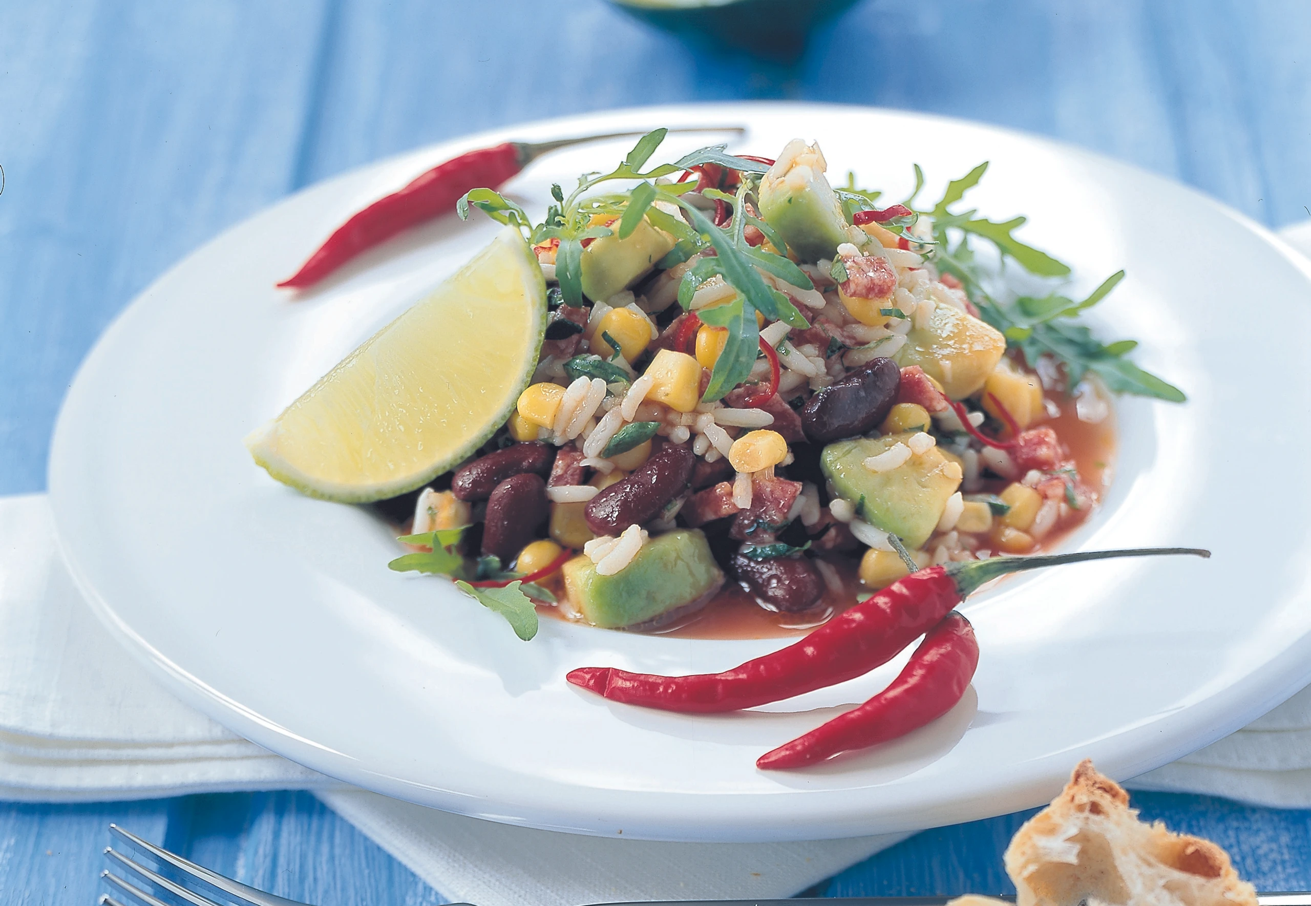 Reis in Salzwasser weich kochen, abgießen und abtropfen lassen. Salami in Würfel schneiden. Bohnen und Mais unter fließendem Wasser abspülen, abtropfen lassen.