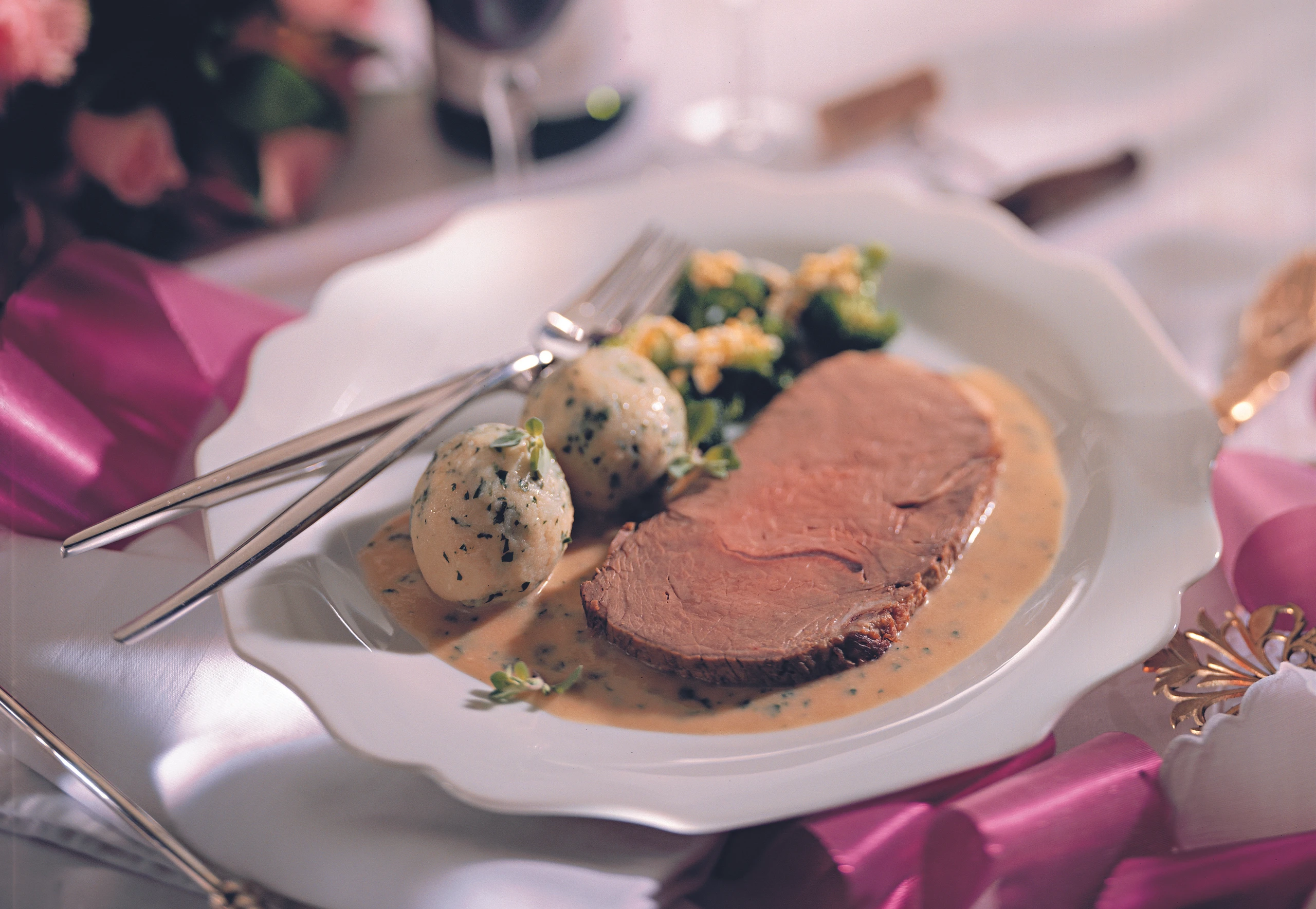 Sauce mit einem Stabmixer pürieren, mit Salz, Pfeffer, Majoran und wenig Zitronensaft würzen. Petersilie einrühren. Fleisch in Scheiben schneiden, mit der Sauce, den Kräuterknöderln und dem Brokkoligemüse (siehe Rezepte) anrichten.