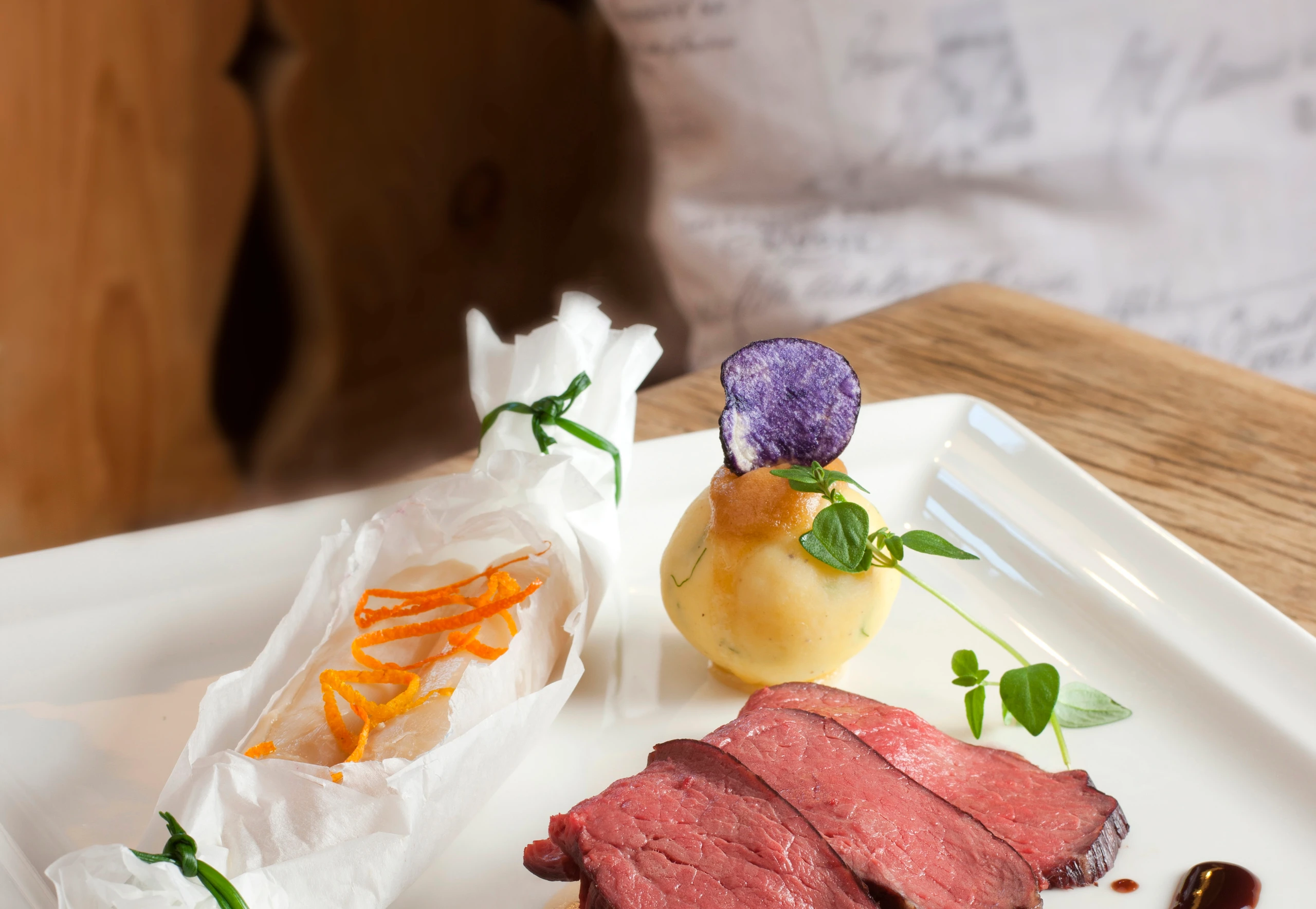- Fleisch aus dem Rohr nehmen, in Scheiben schneiden, mit Sauce, Knödeln und Spargel anrichten. Knödel evtl. mit Butterbröseln und lila Erdäpfelchips garnieren.