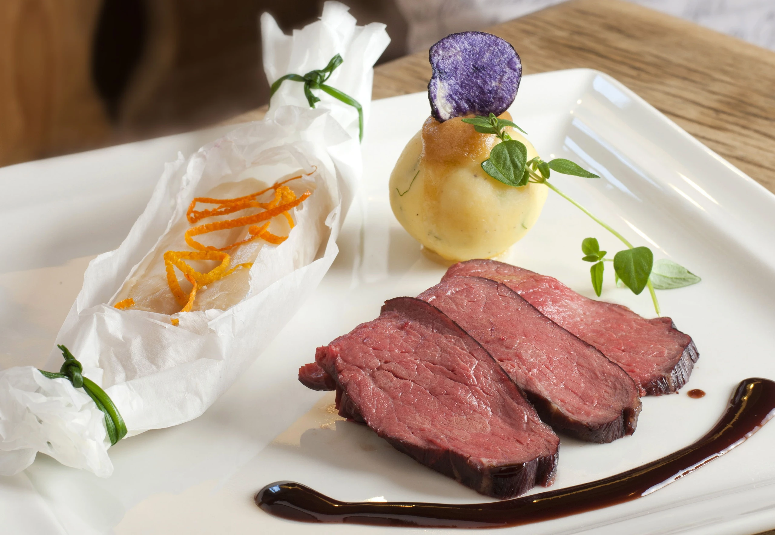- Für die Sauce Portwein auf ca. 80 ml einkochen. Bratensaft zugießen und auf ca. 150 ml einkochen. Sauce durch Einrühren der Butter binden.
