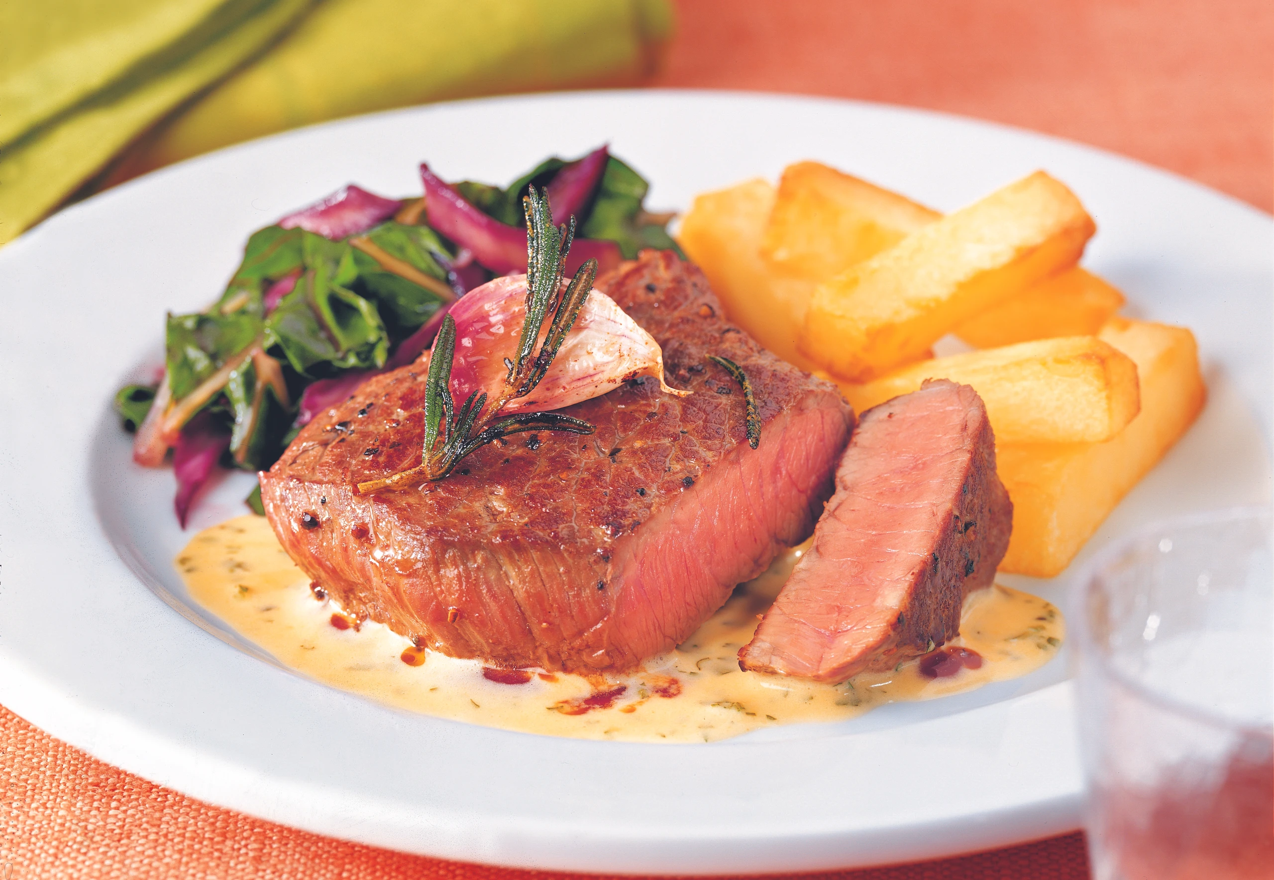 Steaks salzen, pfeffern und in heißem Öl auf jeder Seiten ca. 3 Minuten braten. Nach 2 Minuten Knoblauch, Thymian, Rosmarin und Butter zugeben. Steaks mit Bratensaft übergießen, aus der Pfanne nehmen, in Folie kurz rasten lassen. Steaks mit der Sauce und den Beilagen anrichten.