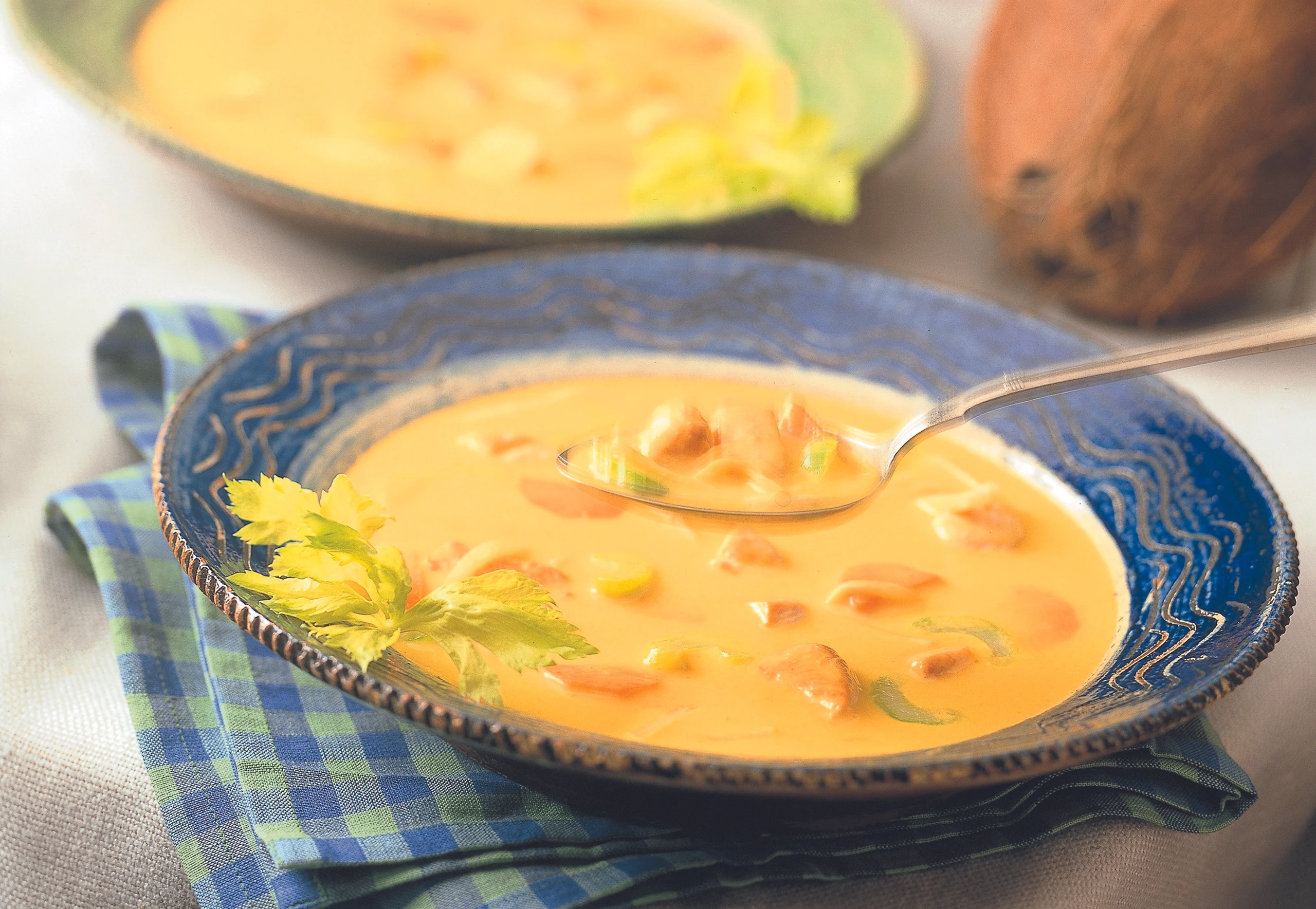 Zwiebeln schälen, klein würfelig schneiden und in Butter anschwitzen, Mehl und Curry einrühren und hell rösten. Einmach vom Herd nehmen und kurz abkühlen lassen. Hühnersuppe erhitzen.