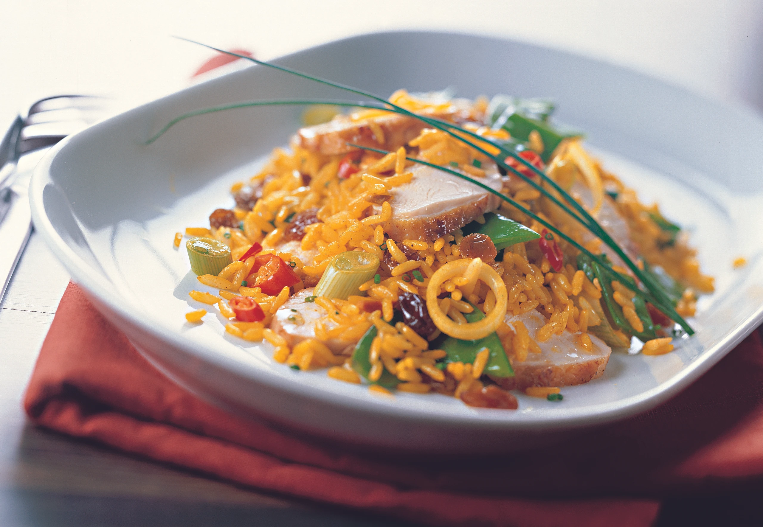 Hühnerfilets salzen, pfeffern und in Öl beidseitig braten. Filets aus der Pfanne heben und kurz rasten lassen. Filets quer zur Faser in 1/2 cm dicke Scheiben schneiden und unter den Reis mischen.