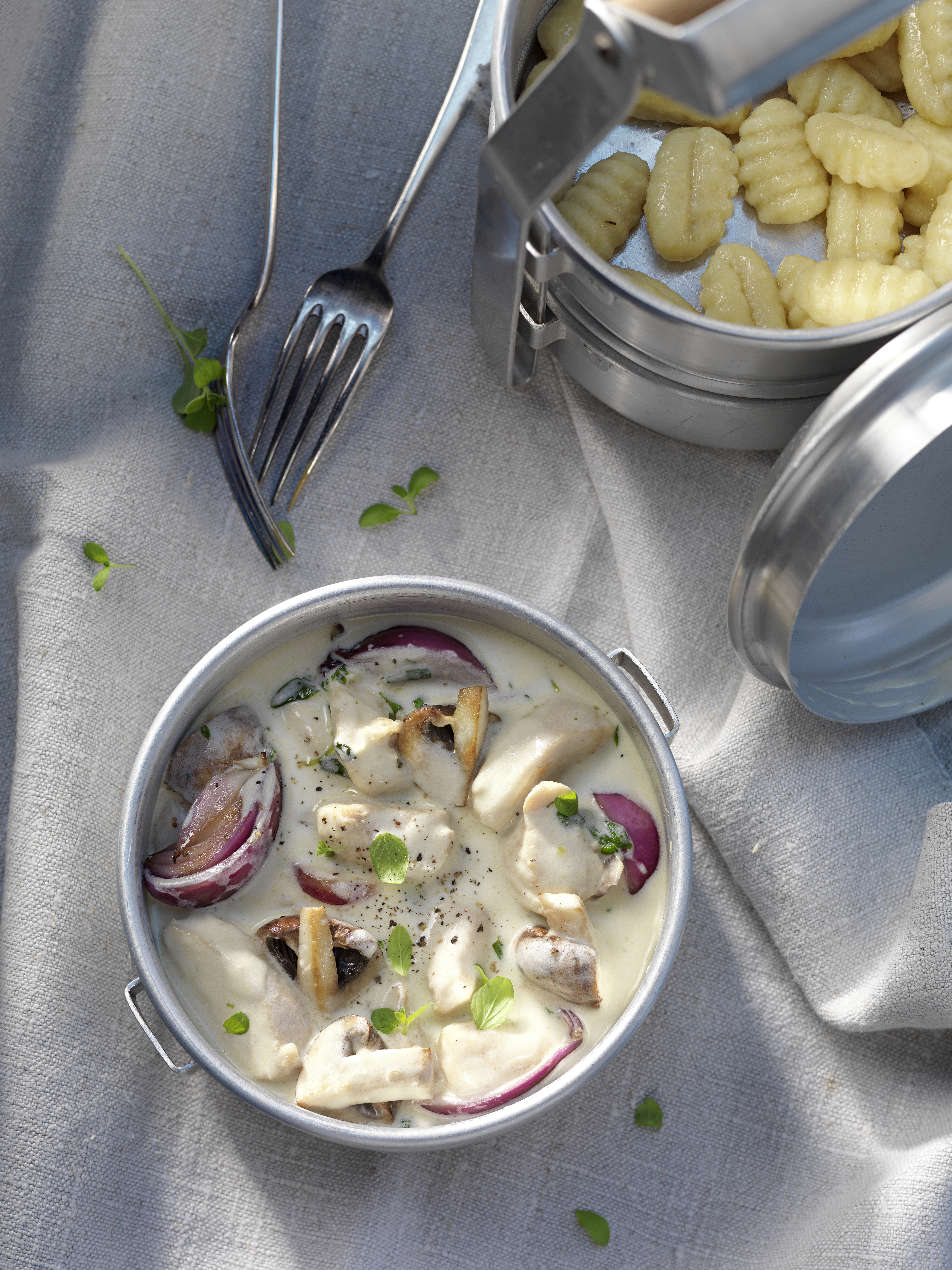 Im Bratrückstand Champignons und Zwiebeln in 1 TL Butter anschwitzen. Suppe und Obers zugießen und aufkochen. Rahm mit 1 EL Mehl verquirlen, in die Sauce rühren und ca. 2 Minuten köcheln. Fleisch untermischen und in der Sauce kurz ziehen lassen.