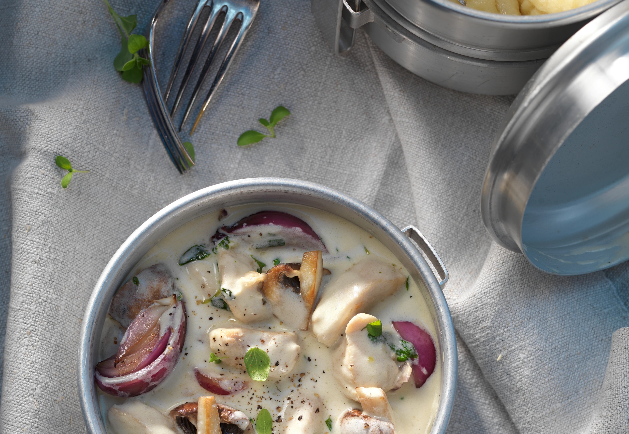Geschnetzeltes pfeffern und mit Majoran bestreut servieren. Als Beilage passen Gnocchi.