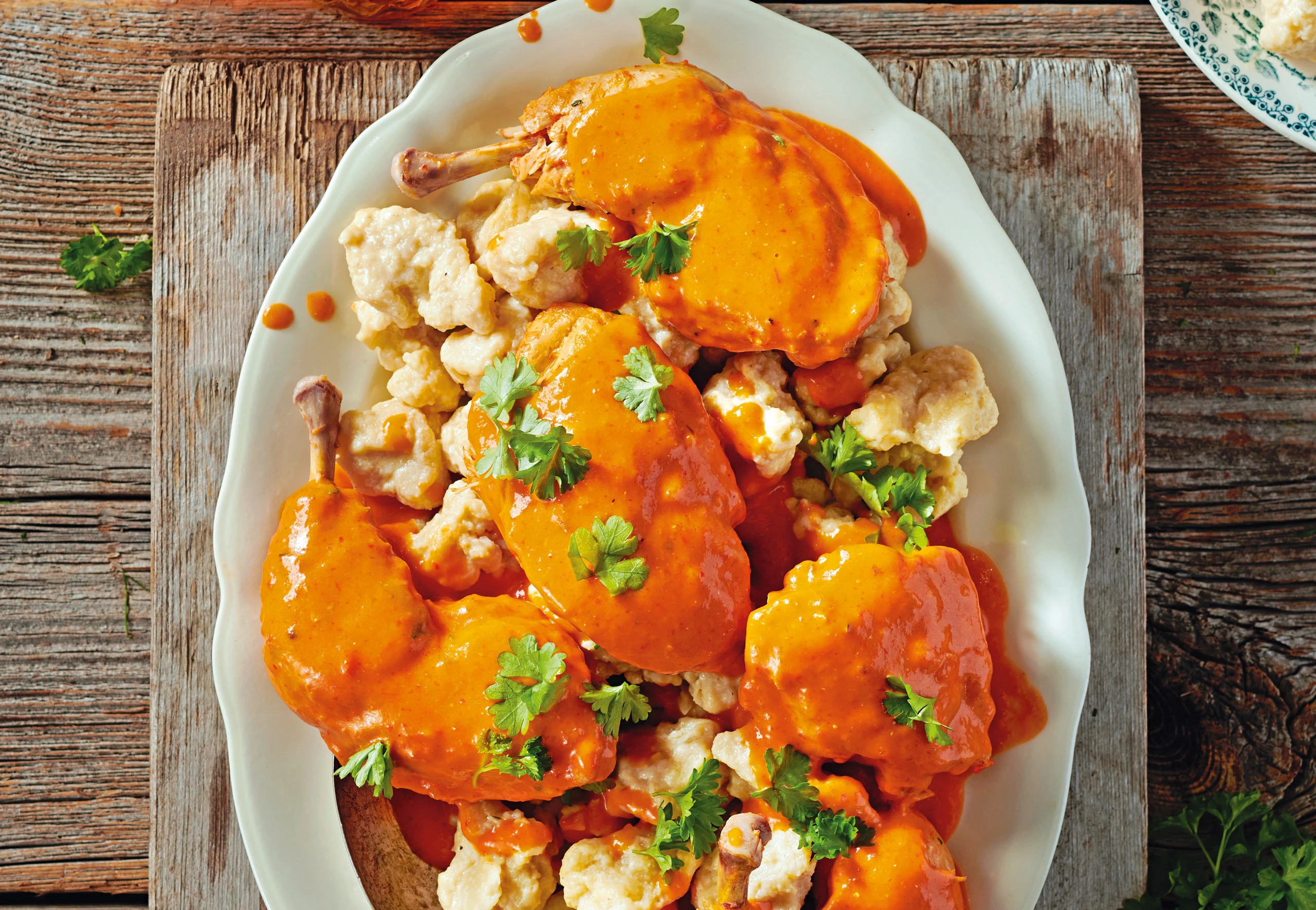Paprikás mit Kerbel bestreuen und mit den Nockerln servieren.