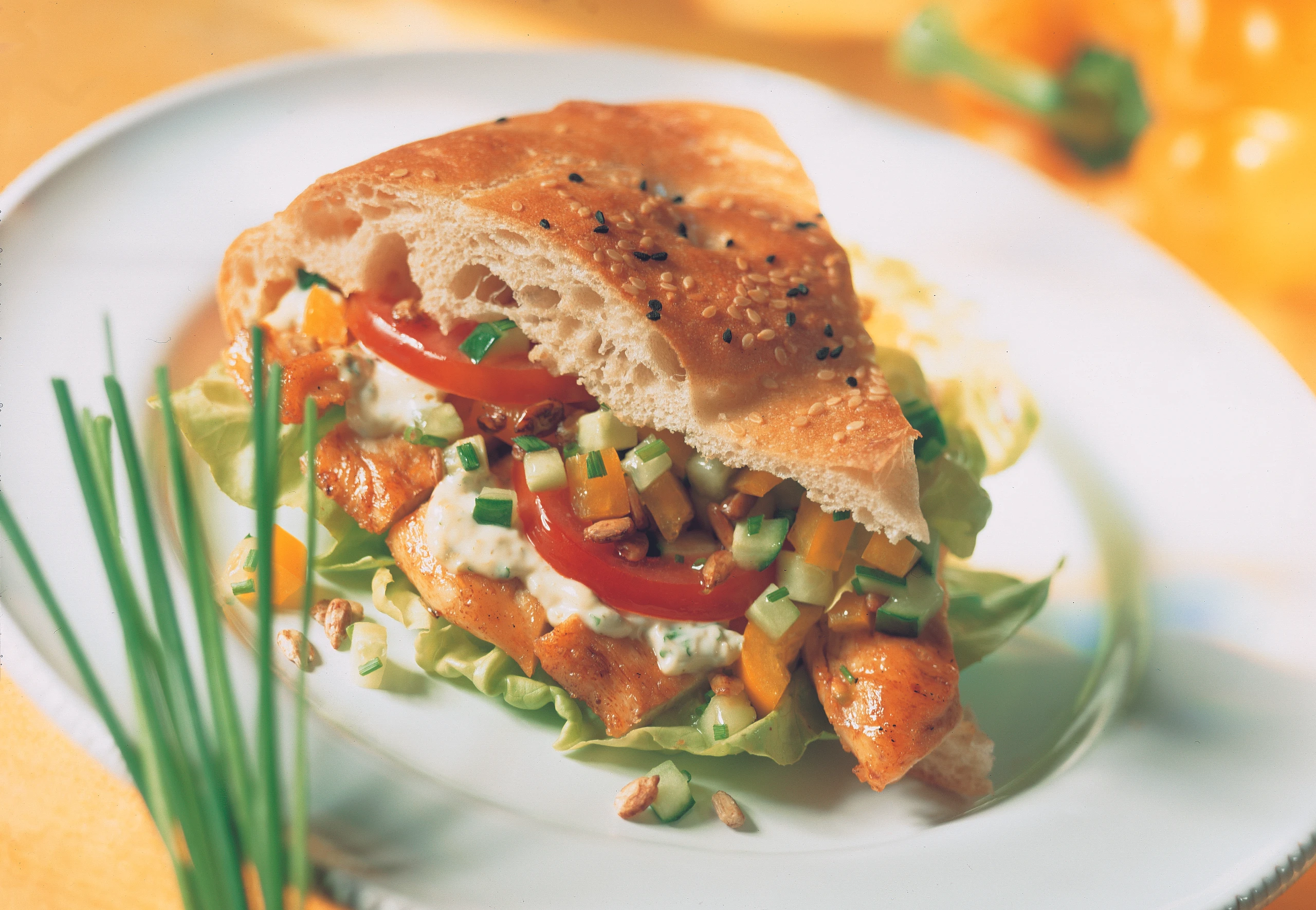 Hühner-Sandwich mit Gemüsesalsa und Senfsauce