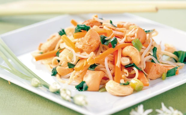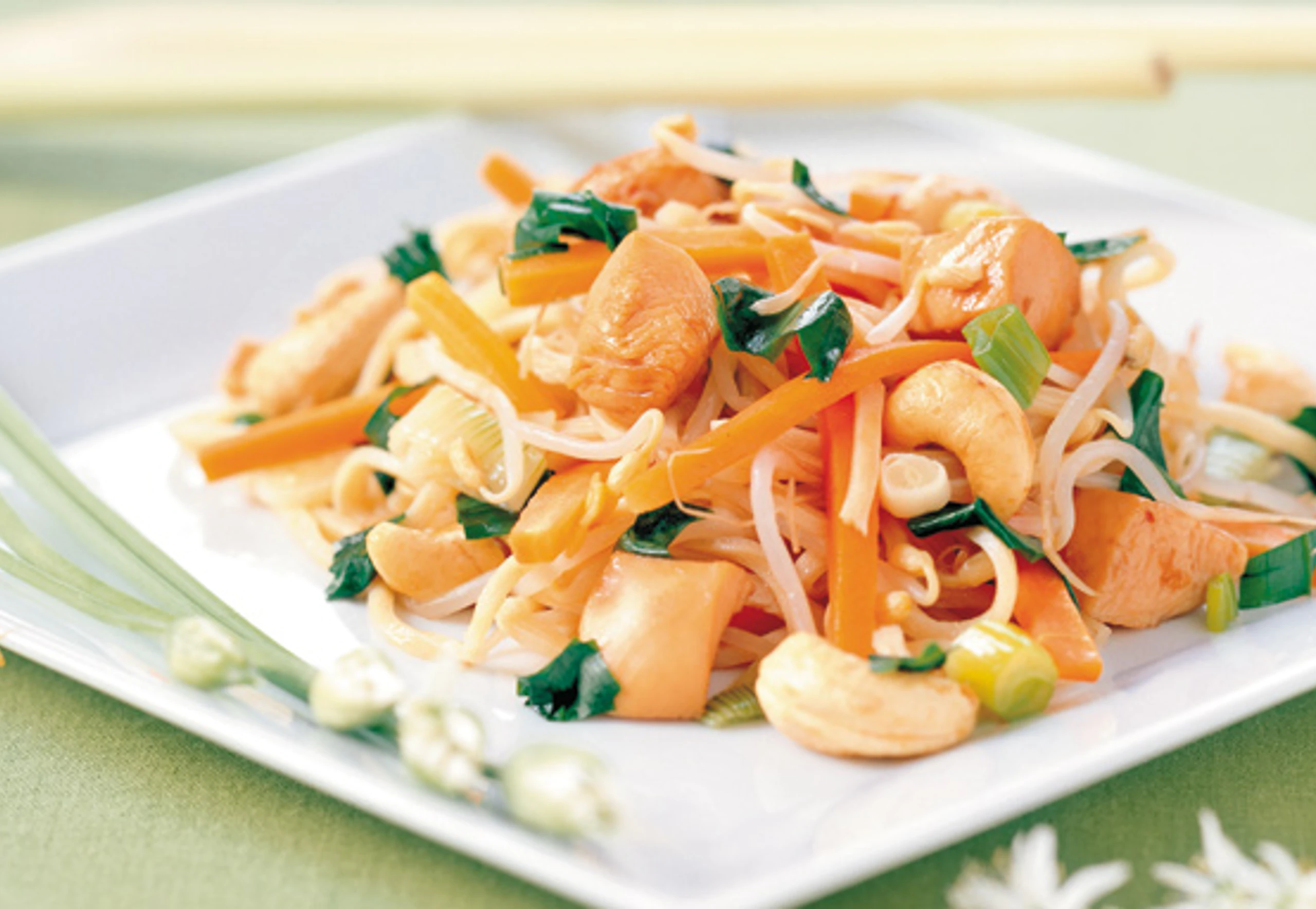 In einem Wok oder einer großen Pfanne Öl kurz erhitzen, Karotten zugeben und bissfest anbraten. Hühnerstücke samt Marinade untermischen und kurz erhitzen. Zuletzt Sojasprossen und Cashewnüsse zufügen und kurz mitbraten. Hühnerwok sofort servieren - die Nudeln noch im Wok untermischen oder auf vorgewärmten Tellern anrichten und mit dem Wokgemüse bedecken.
