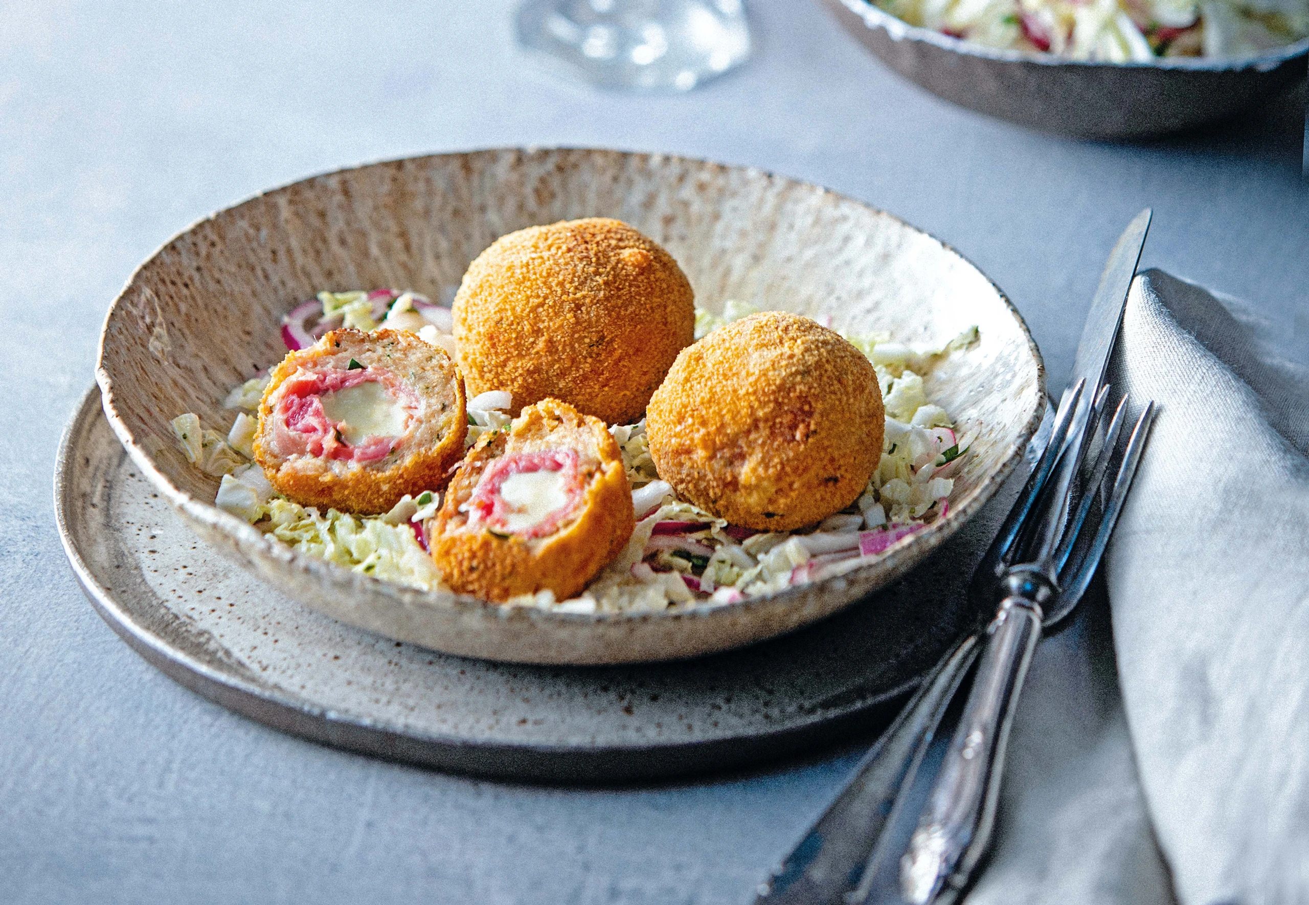 Hühnerbällchen mit Schinken-Käsefülle und Chinakohlsalat