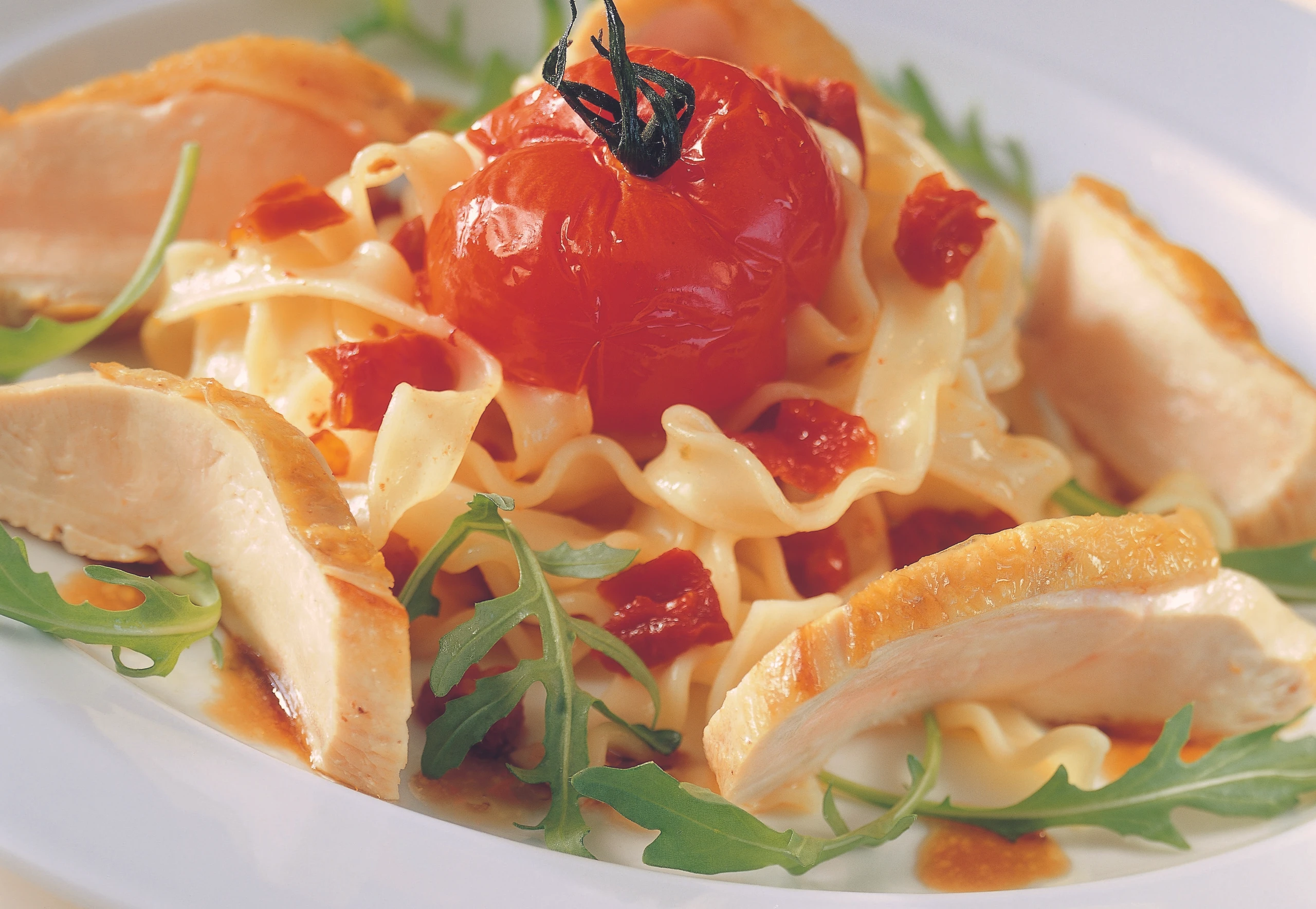 Hühnerfilets quer in Scheiben schneiden. Rucola erst unmittelbar vor dem Anrichten mit den Nudeln vermischen. Hühnerfilets mit dem Pastasalat, den gebratenen Paradeisern und den Knoblauchzehen servieren.