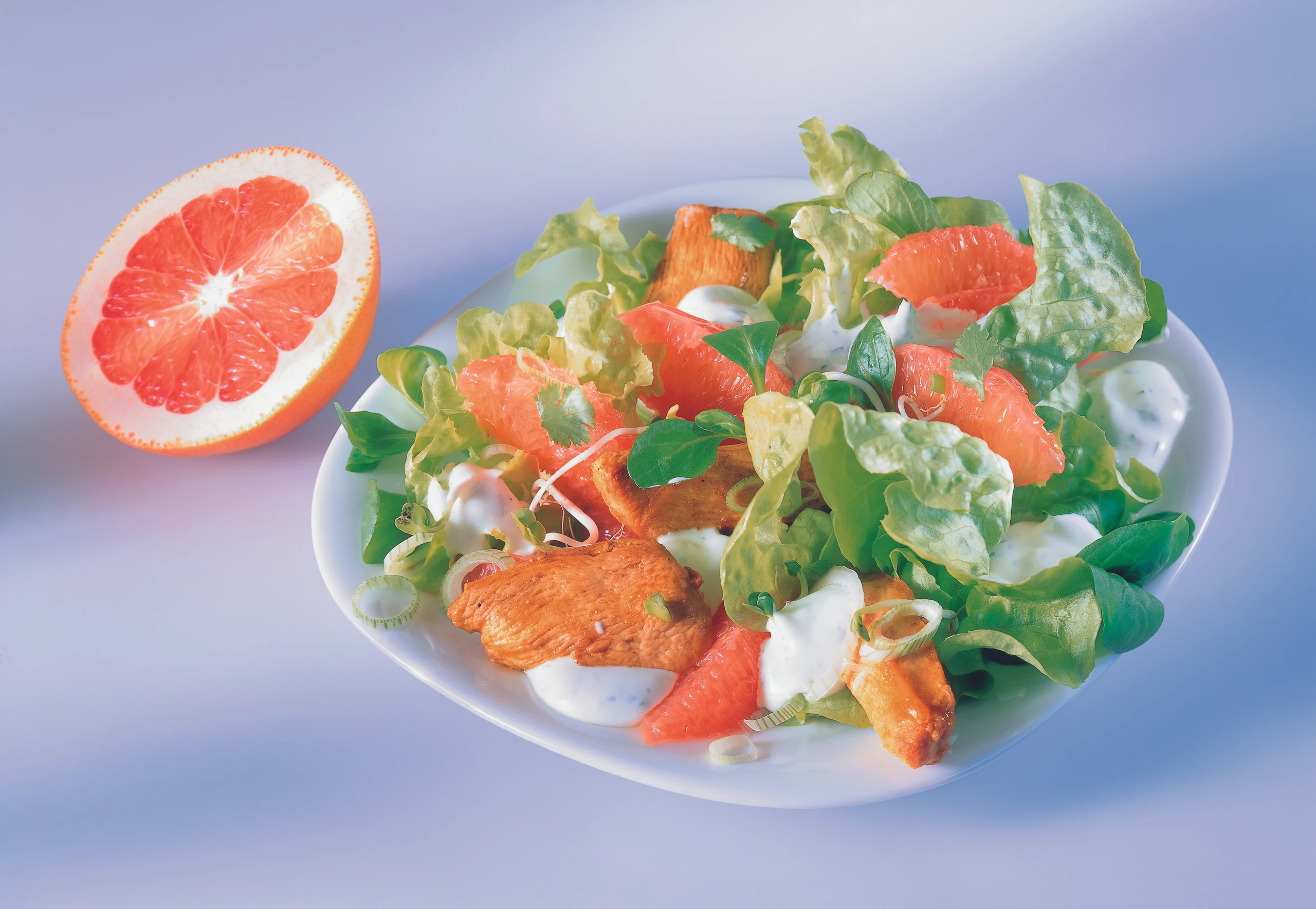 Hühnerbrust mit Grapefruit, Blattsalaten und Sprossen