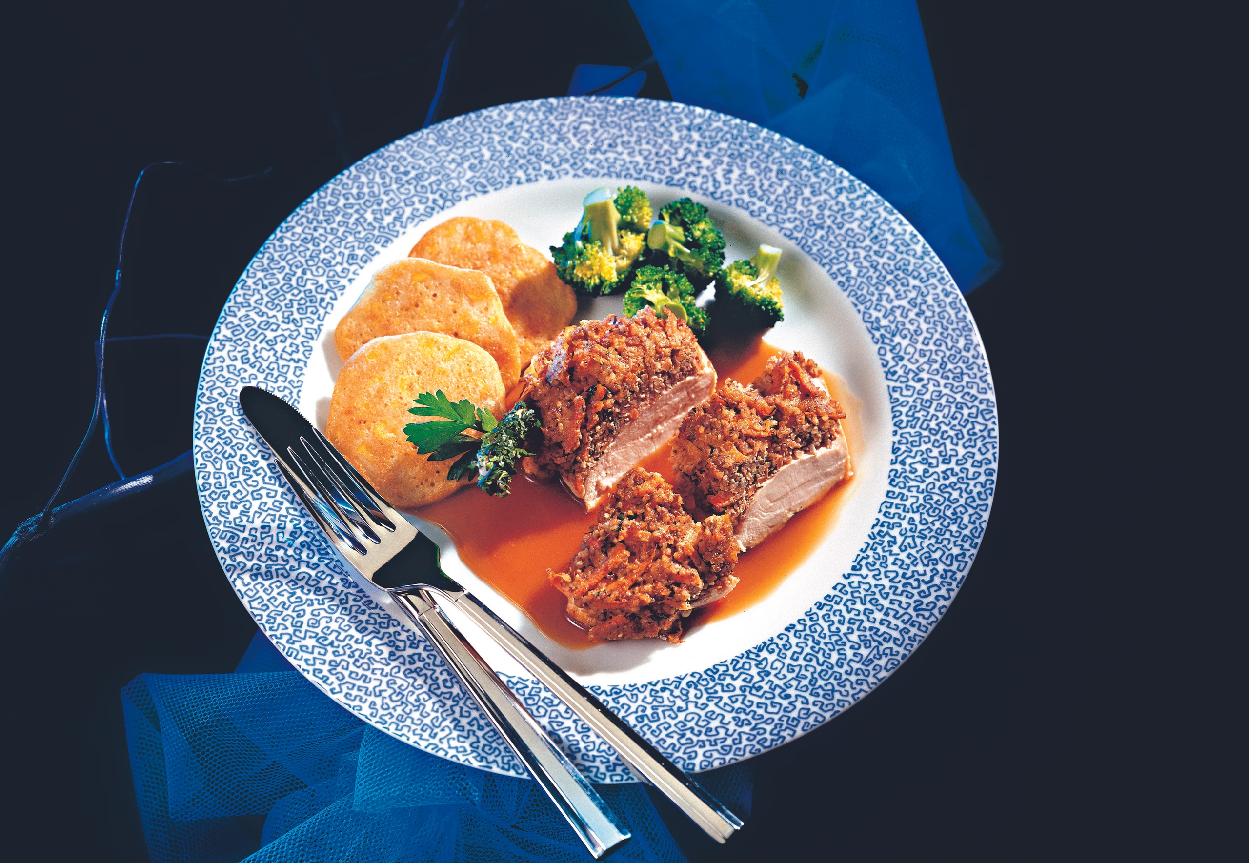 Hühnerbrust mit Karotten-Nusskruste und Maislaibchen