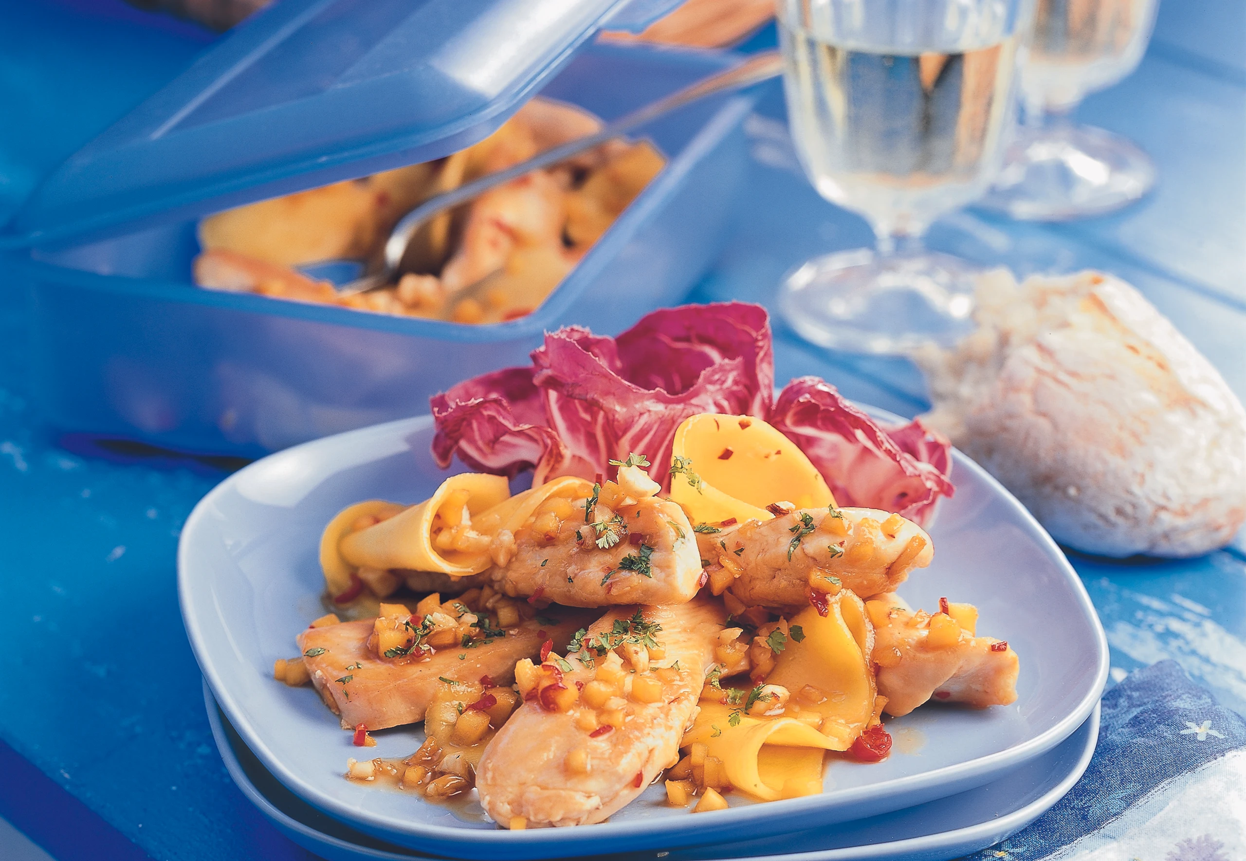 Fleisch aus der Pfanne nehmen, kurz überkühlen lassen und noch warm mit der Mango-Salsa marinieren. Mangoscheiben zugeben. Mit Radicchio servieren.