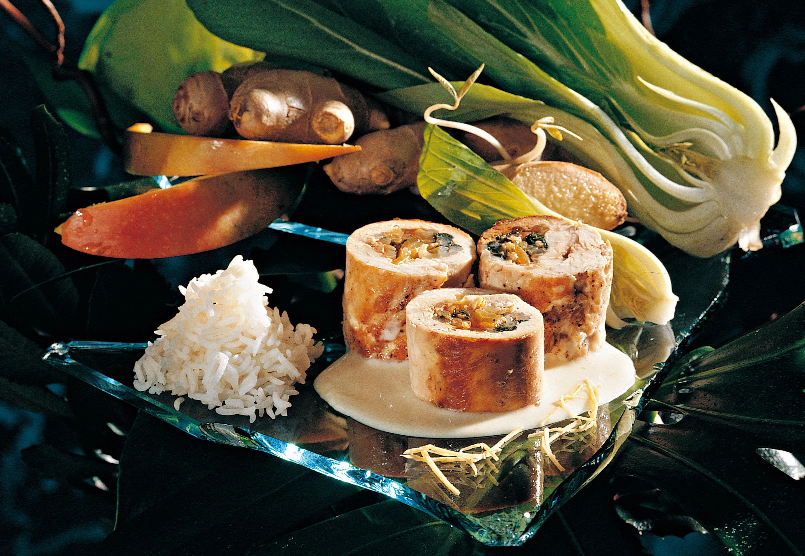 Filets der Länge nach einschneiden, aufklappen und behutsam flachdrücken. Die halbe Fläche jedes Schnitzels mit Fülle belegen, Fleisch straff darüber einrollen.
