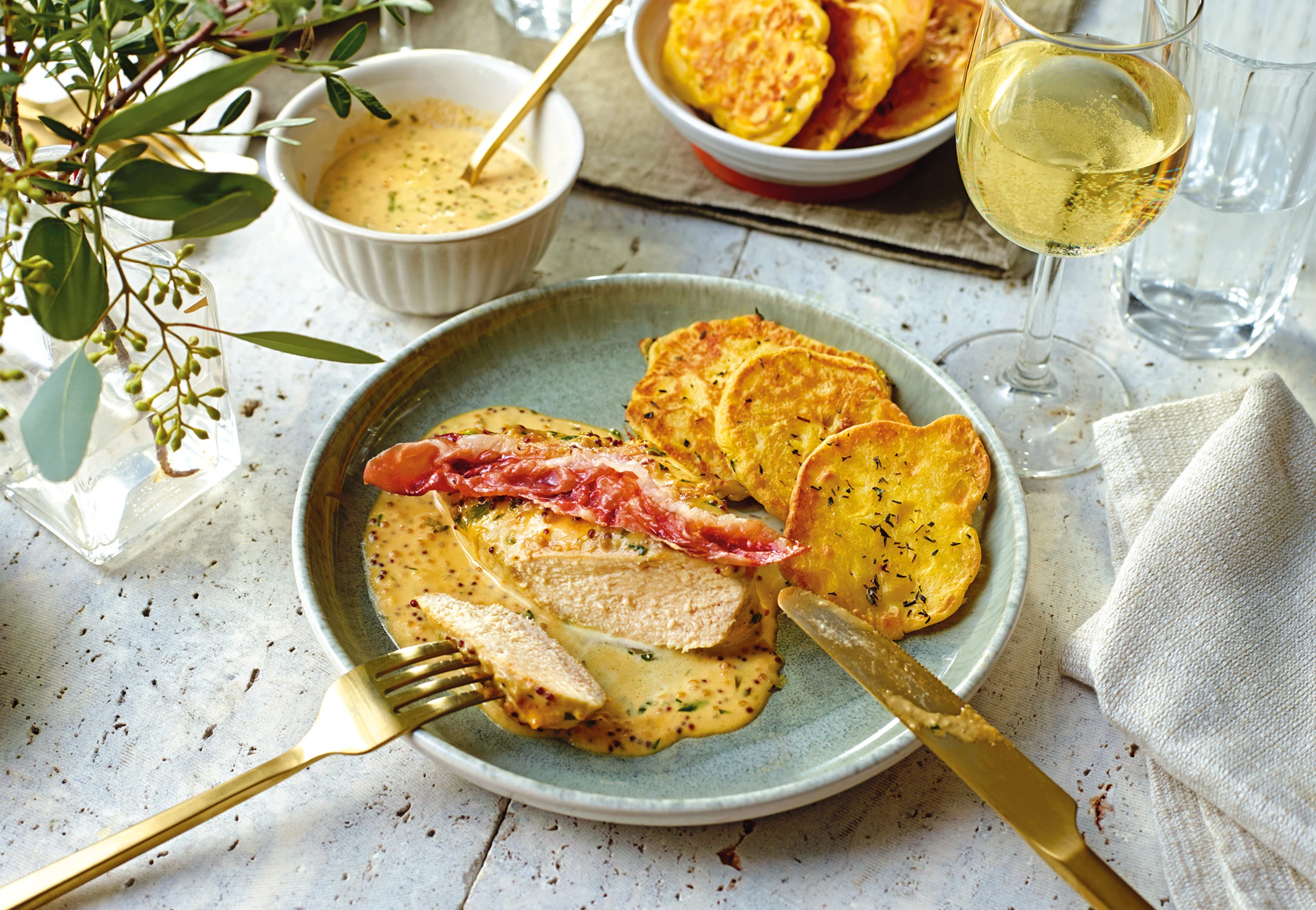Hühnerbrustfilet mit Senf-Oberssauce, Prosciutto und Maiskrapferln