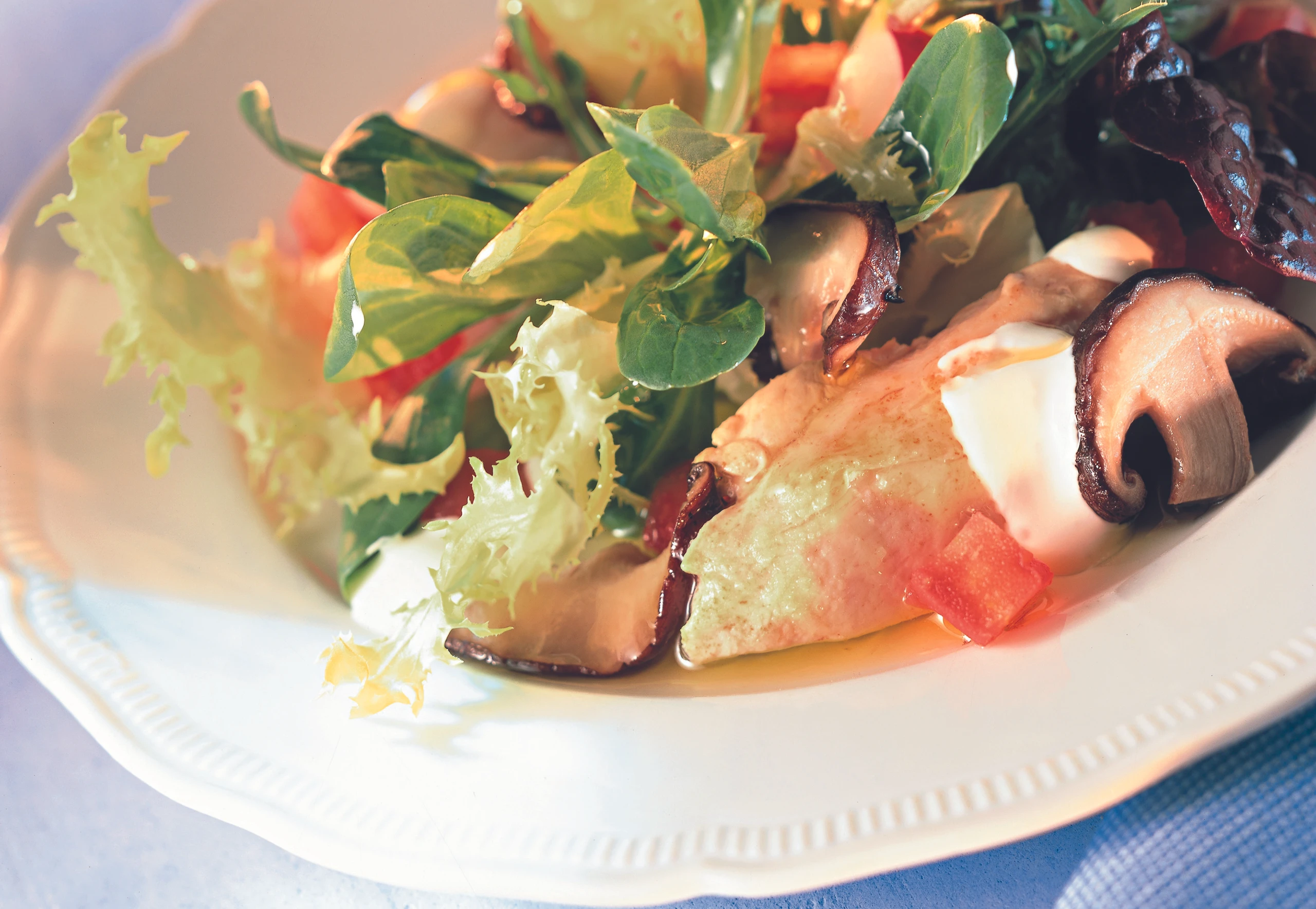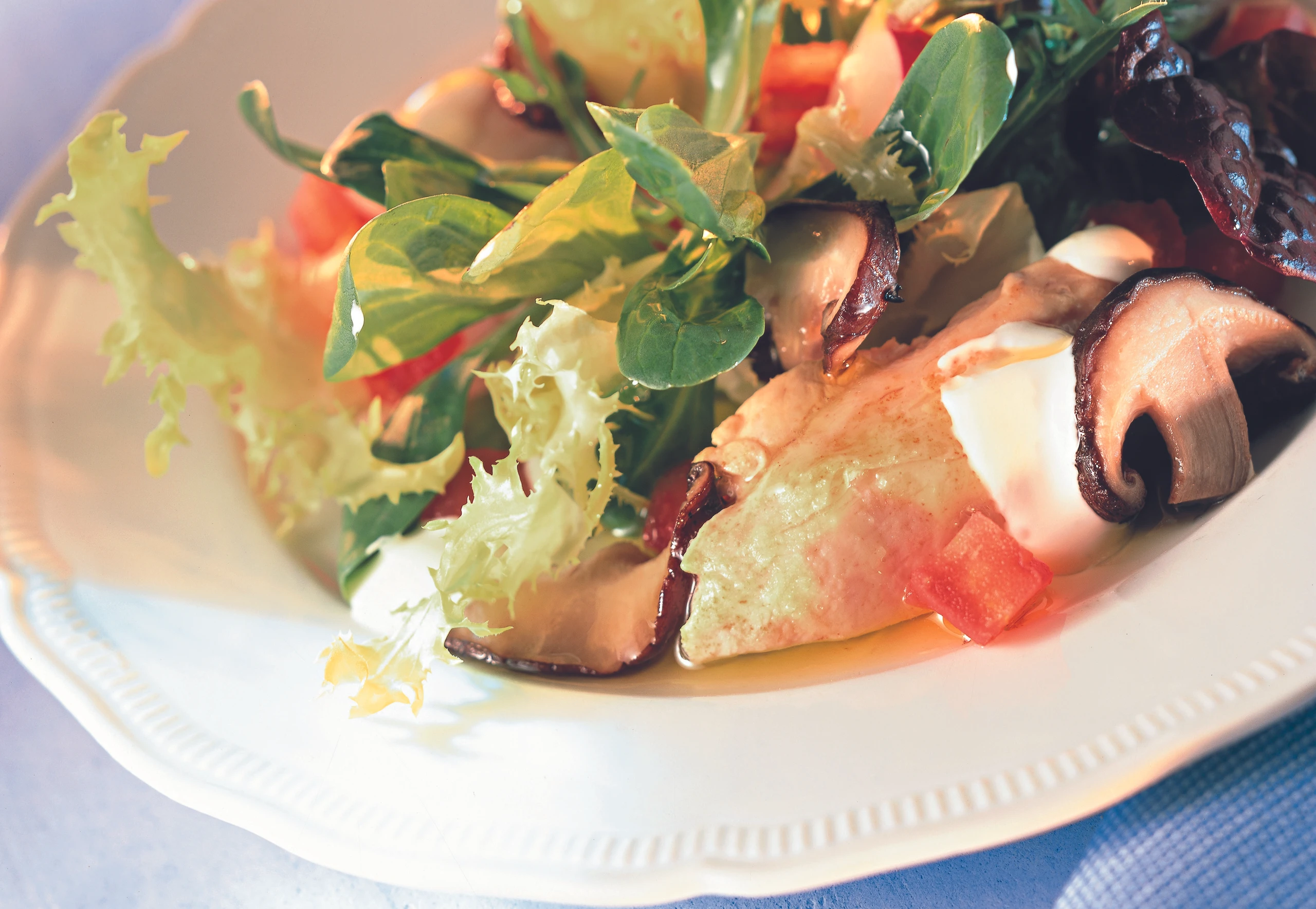 Salate waschen und gut abtropfen lassen. Radieschen putzen, waschen und in Spalten schneiden. Shii take putzen, kurz waschen und in Scheiben schneiden.