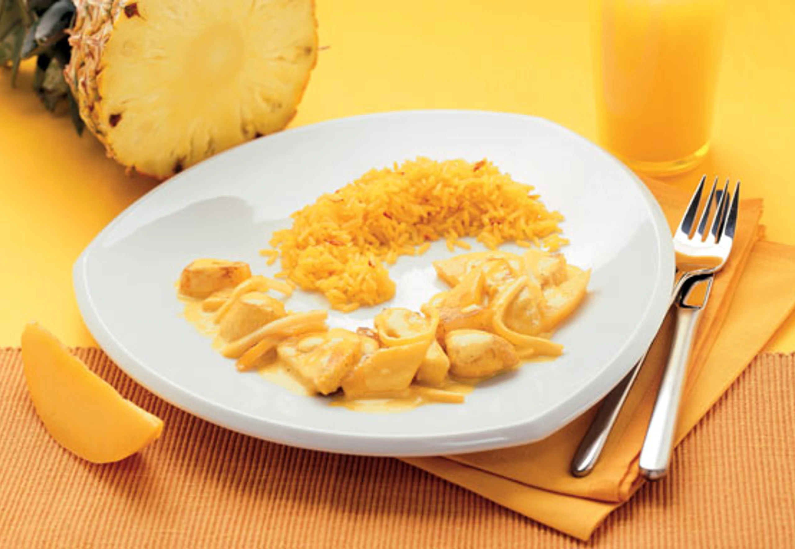 Hühnercurry mit Ananas und Mango auf Safranreis