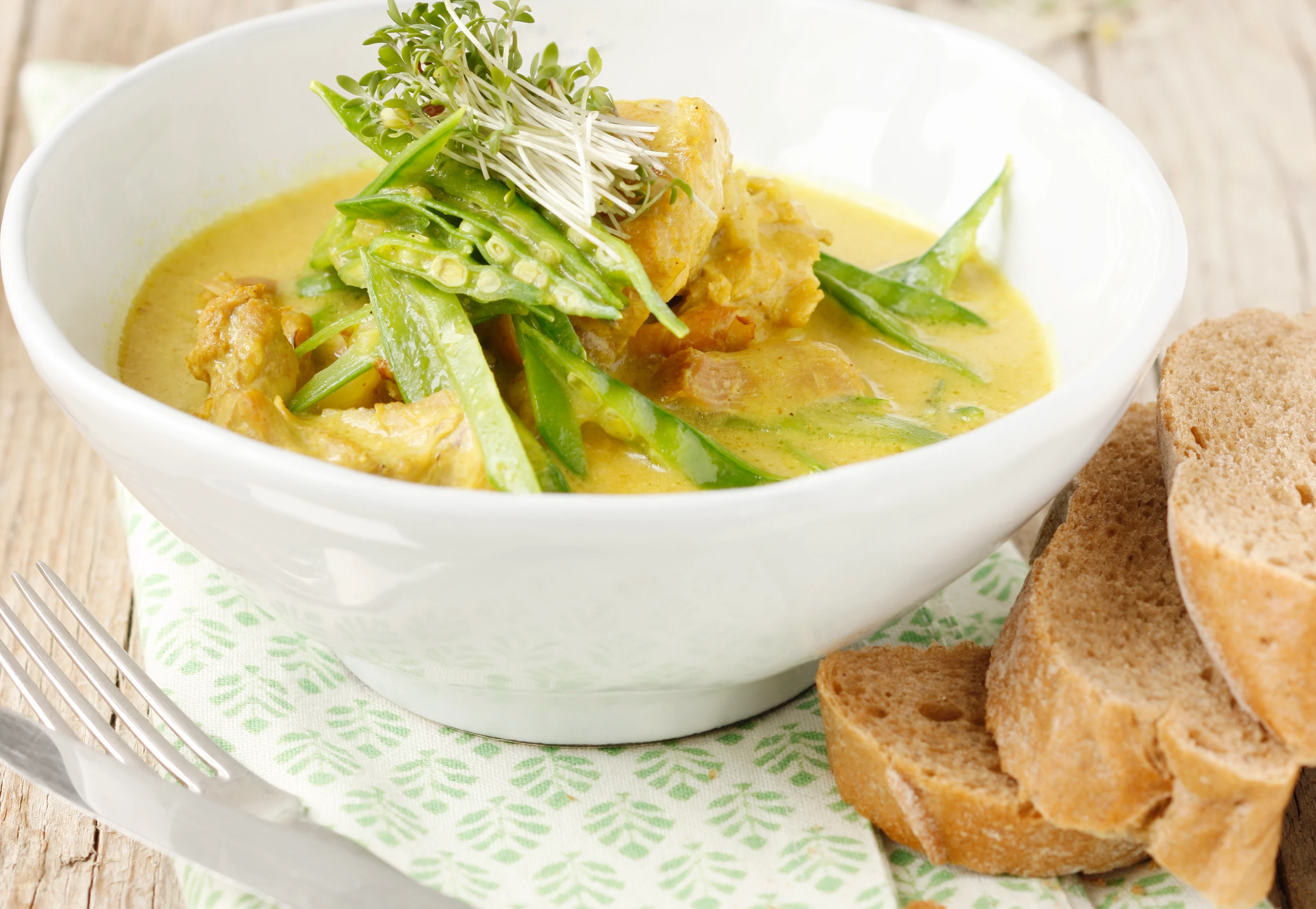 - Keulen herausheben. Crème fraîche, Senf, Curry und Stärke vermischen und in die Sauce rühren. Sauce aufkochen, Keulen und Schoten darin erhitzen. Kresseblättchen von den Stielen schneiden. Curry anrichten und mit Kresse garnieren.