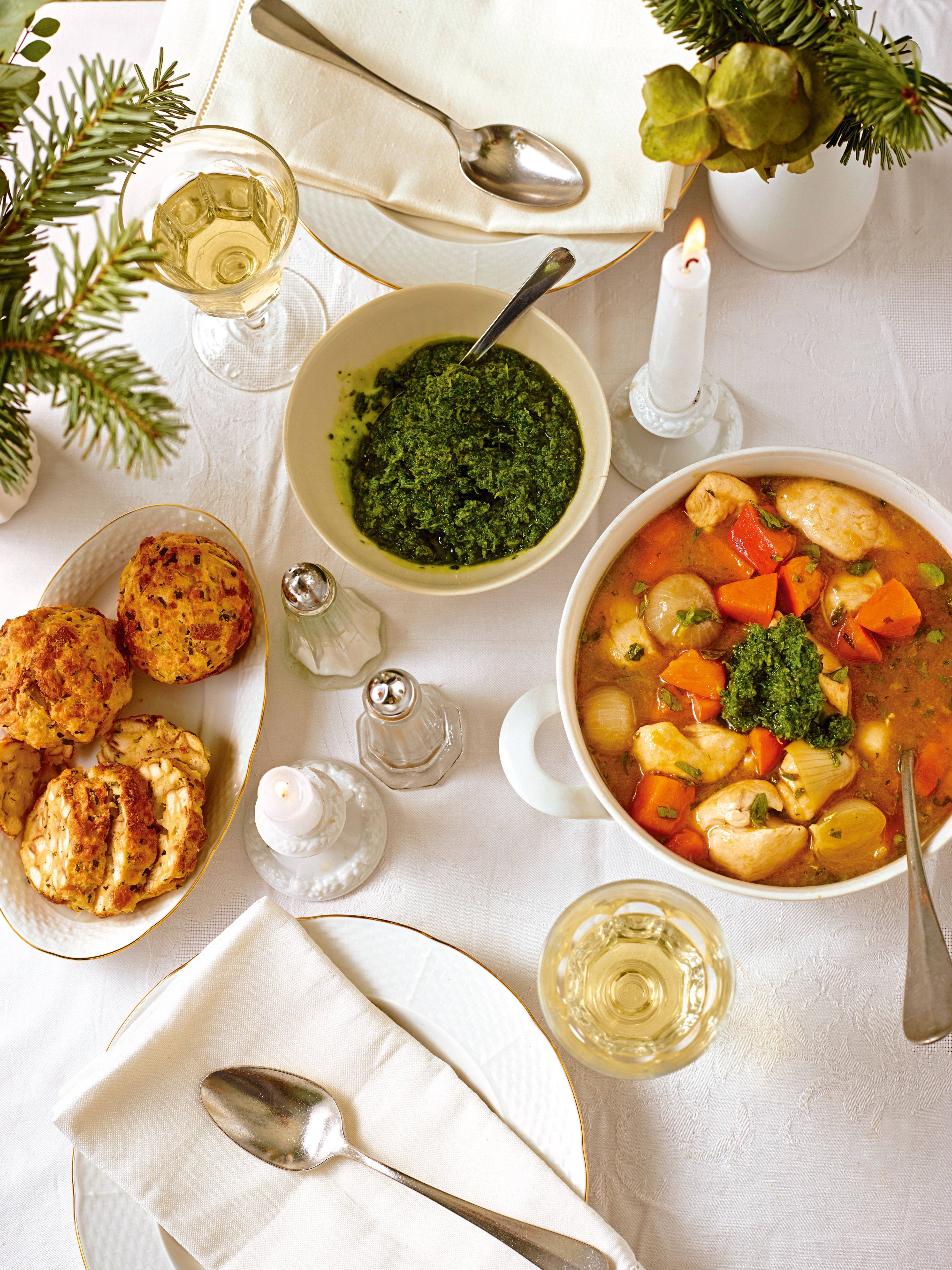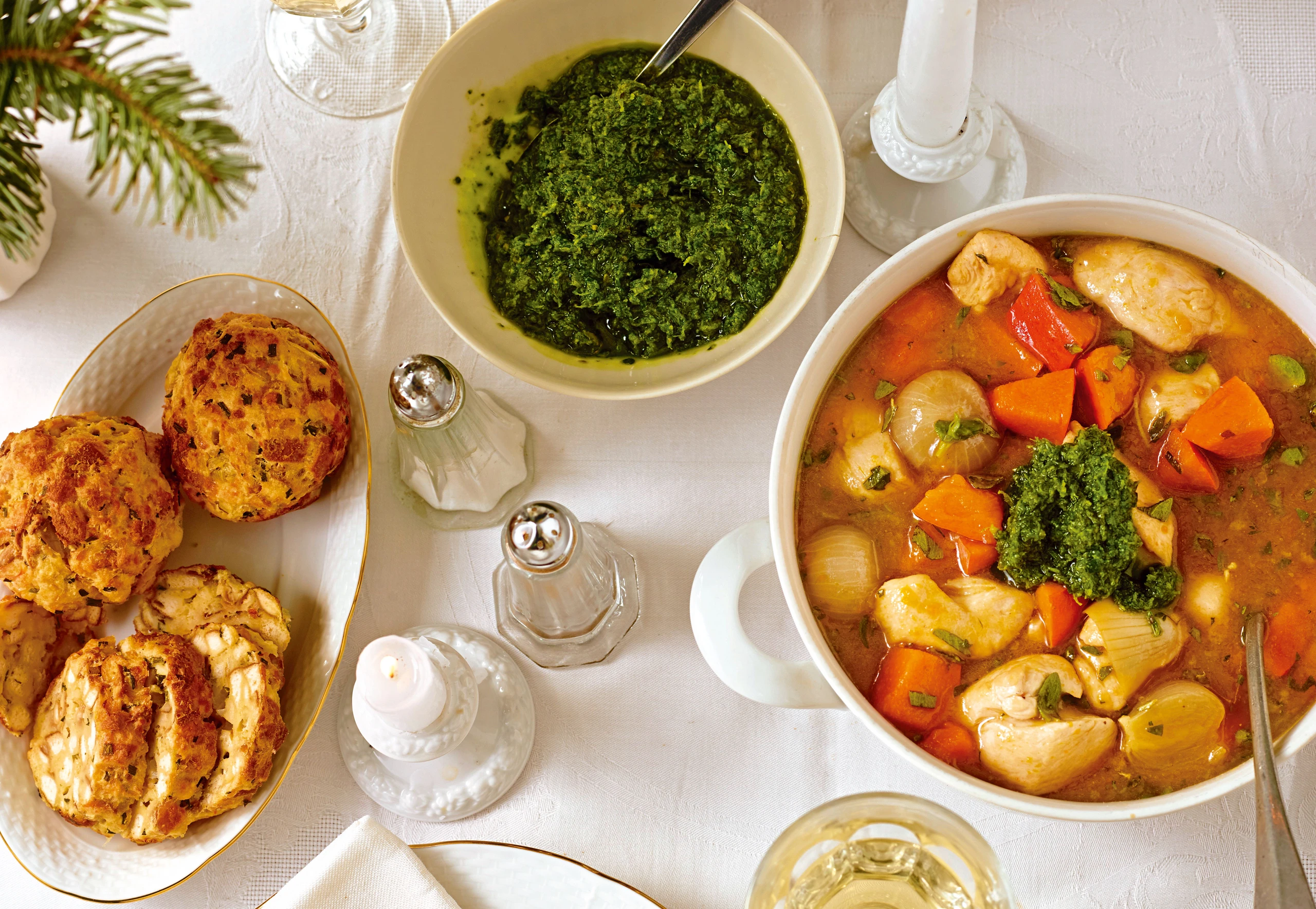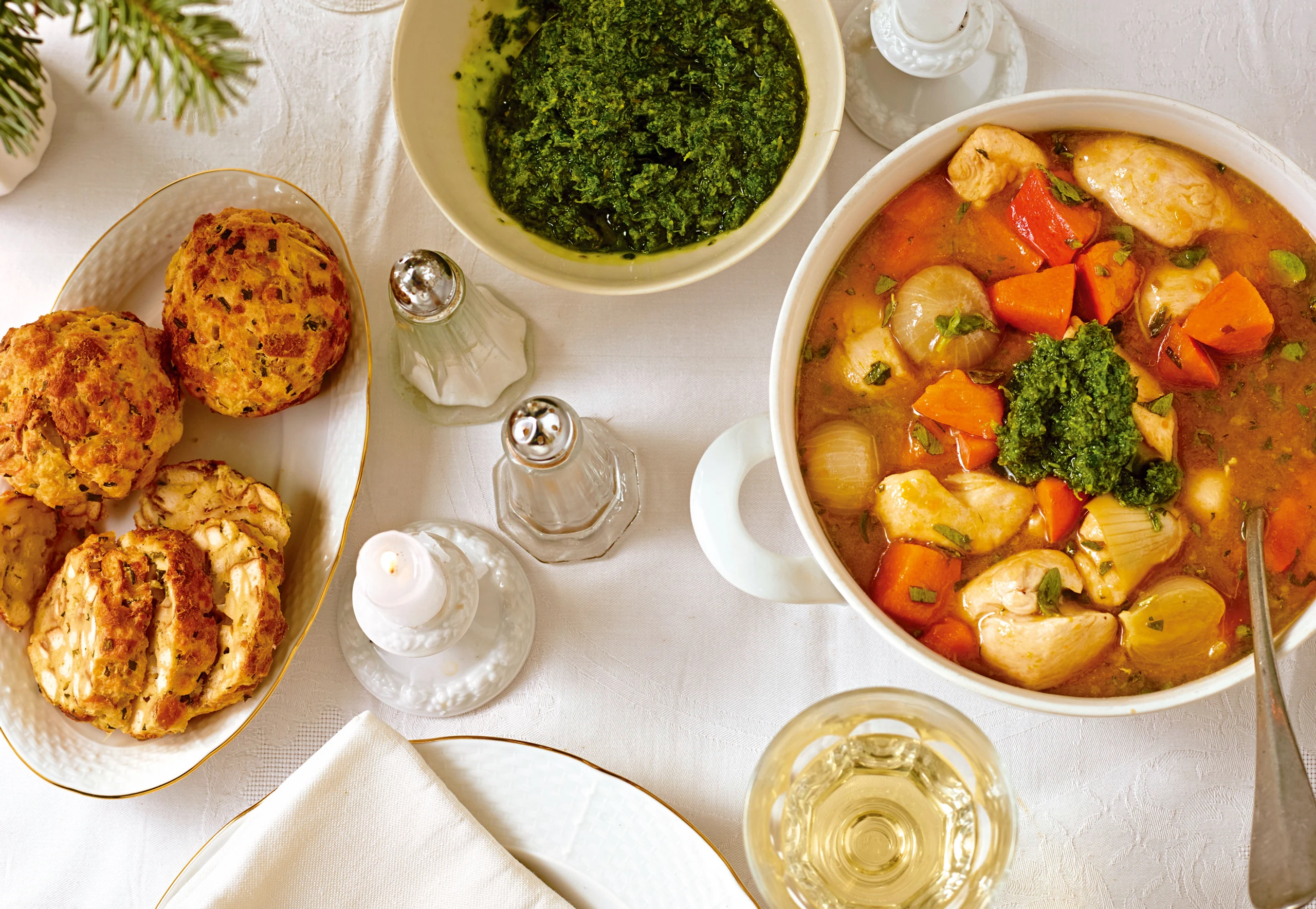 Hühnereintopf mit Kürbis und Laugenmuffins