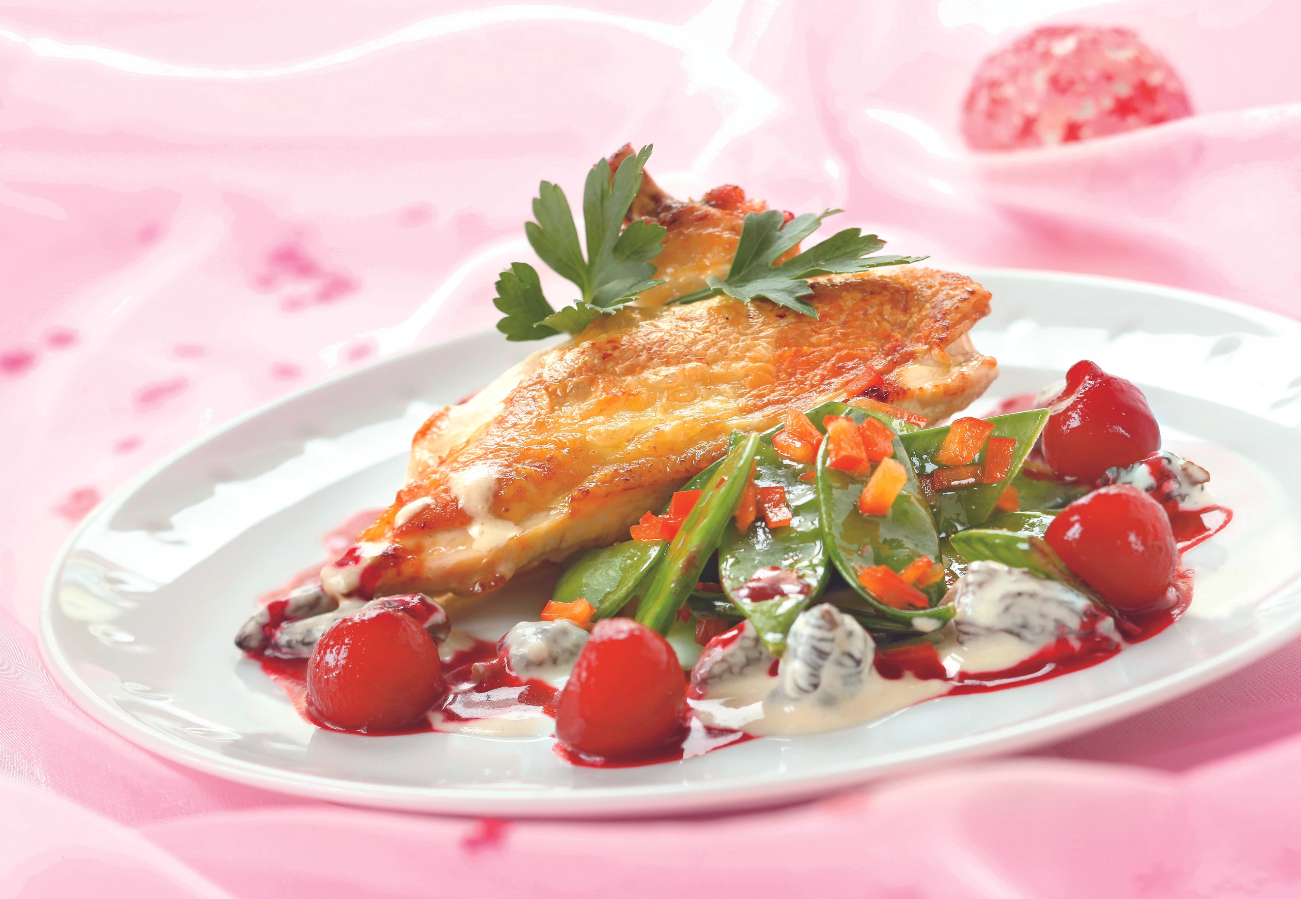 Hühnerfilet mit Erbsenschoten und roten Erdäpfeln