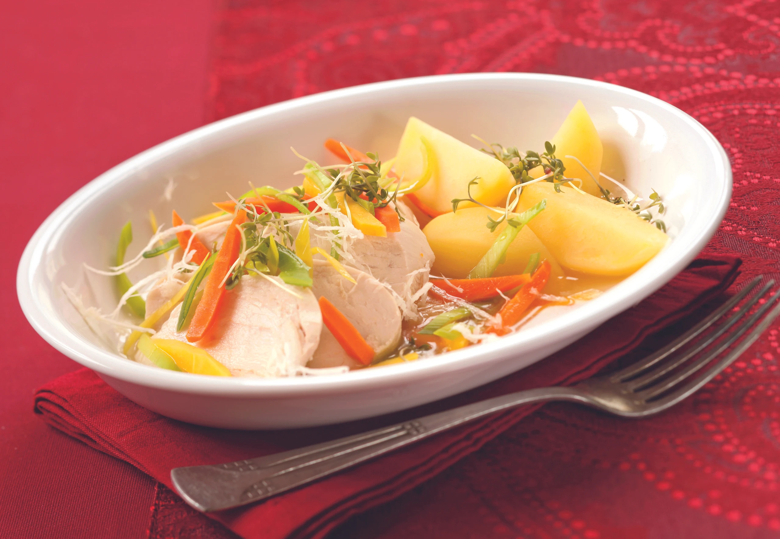 Suppe aufkochen, Stärke einrühren und 1 Minute köcheln. Eventuell mit Salz und Pfeffer nachwürzen. Filets in Scheiben schneiden, mit Fond und Gemüse anrichten. Mit gerissenem Kren und evtl. mit Kresse bestreut servieren. Dazu passen Erdäpfel.