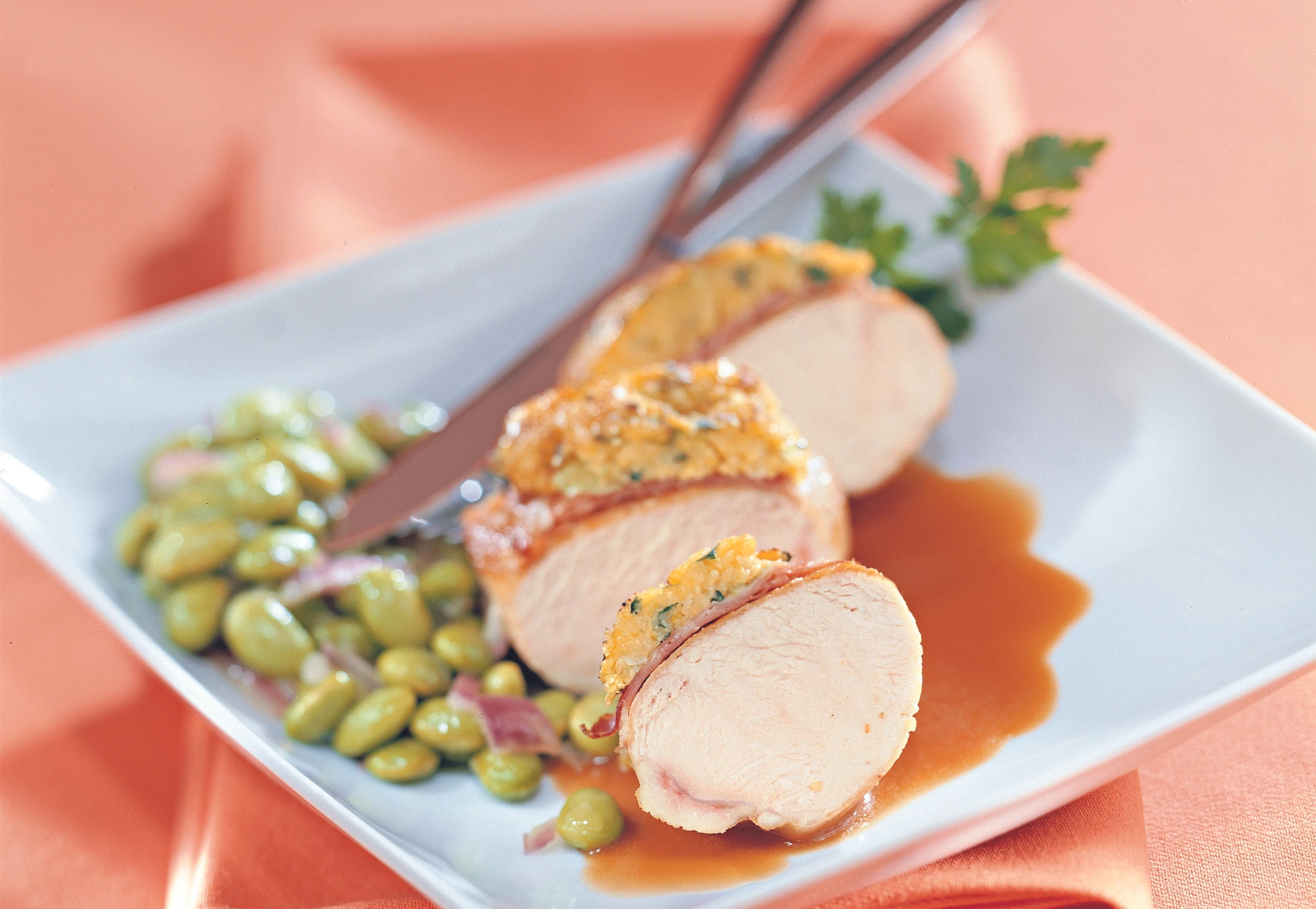 Filets aus der Form nehmen. Bratrückstand mit Bratensaft aufgießen und aufkochen. Filets mit Saft und Sojabohnen anrichten.