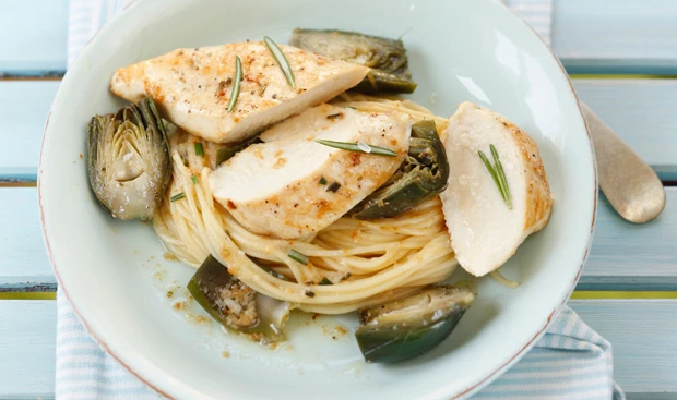 Parallel dazu Spaghetti in Salzwasser bissfest kochen, abseihen, kurz abschrecken und abtropfen lassen. Fleisch aus der Pfanne nehmen und warm stellen. Im Bratrückstand Artischocken und Spaghetti schwenken, mit Salz, Pfeffer und übrigem Zitronensaft würzen. Fleisch in Stücke schneiden, mit Spaghetti und Artischocken anrichten.