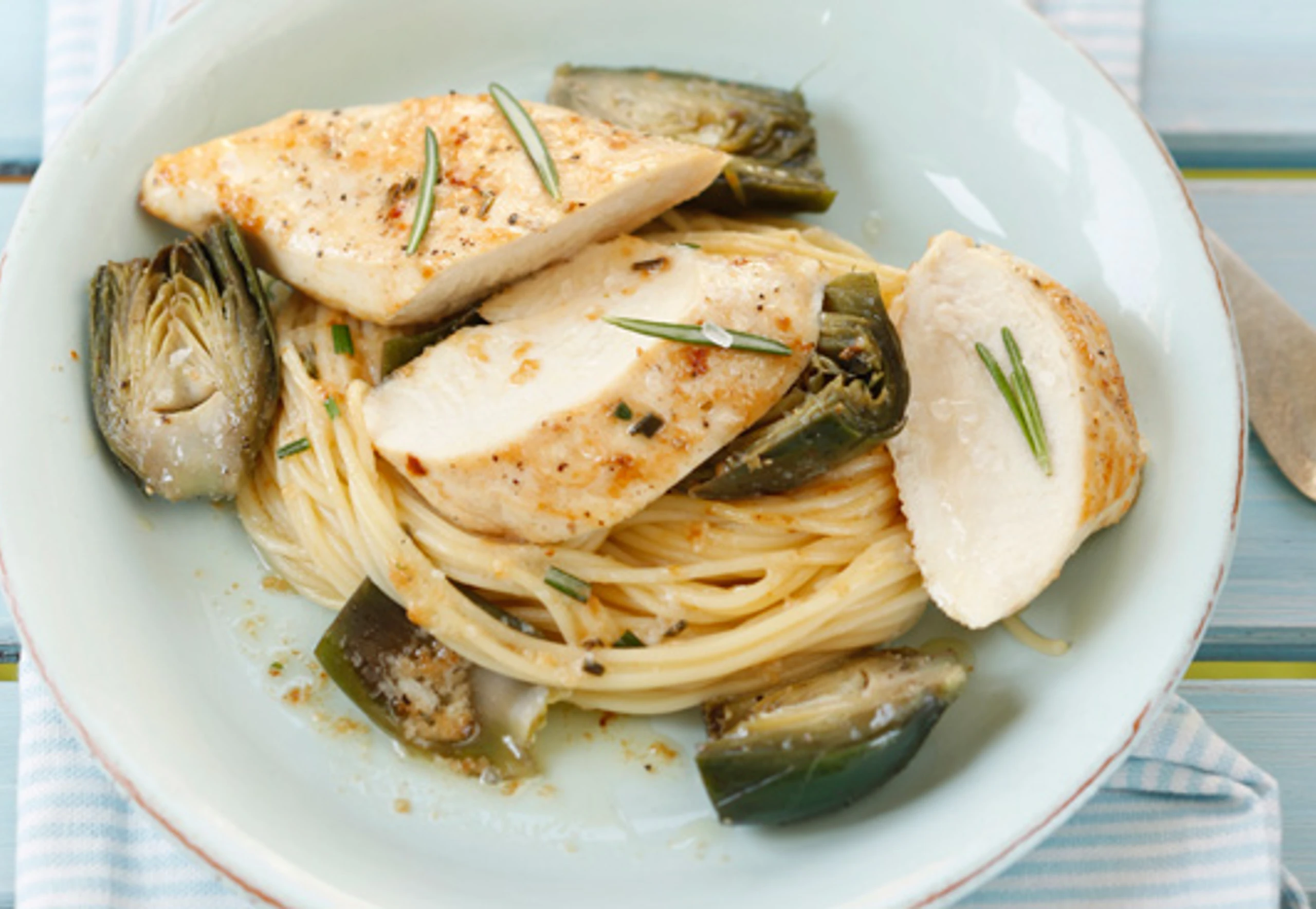 - Parallel dazu Spaghetti in Salzwasser bissfest kochen, abseihen, kurz abschrecken und abtropfen lassen. Fleisch aus der Pfanne nehmen und warm stellen. Im Bratrückstand Artischocken und Spaghetti schwenken, mit Salz, Pfeffer und übrigem Zitronensaft würzen. Fleisch in Stücke schneiden, mit Spaghetti und Artischocken anrichten.