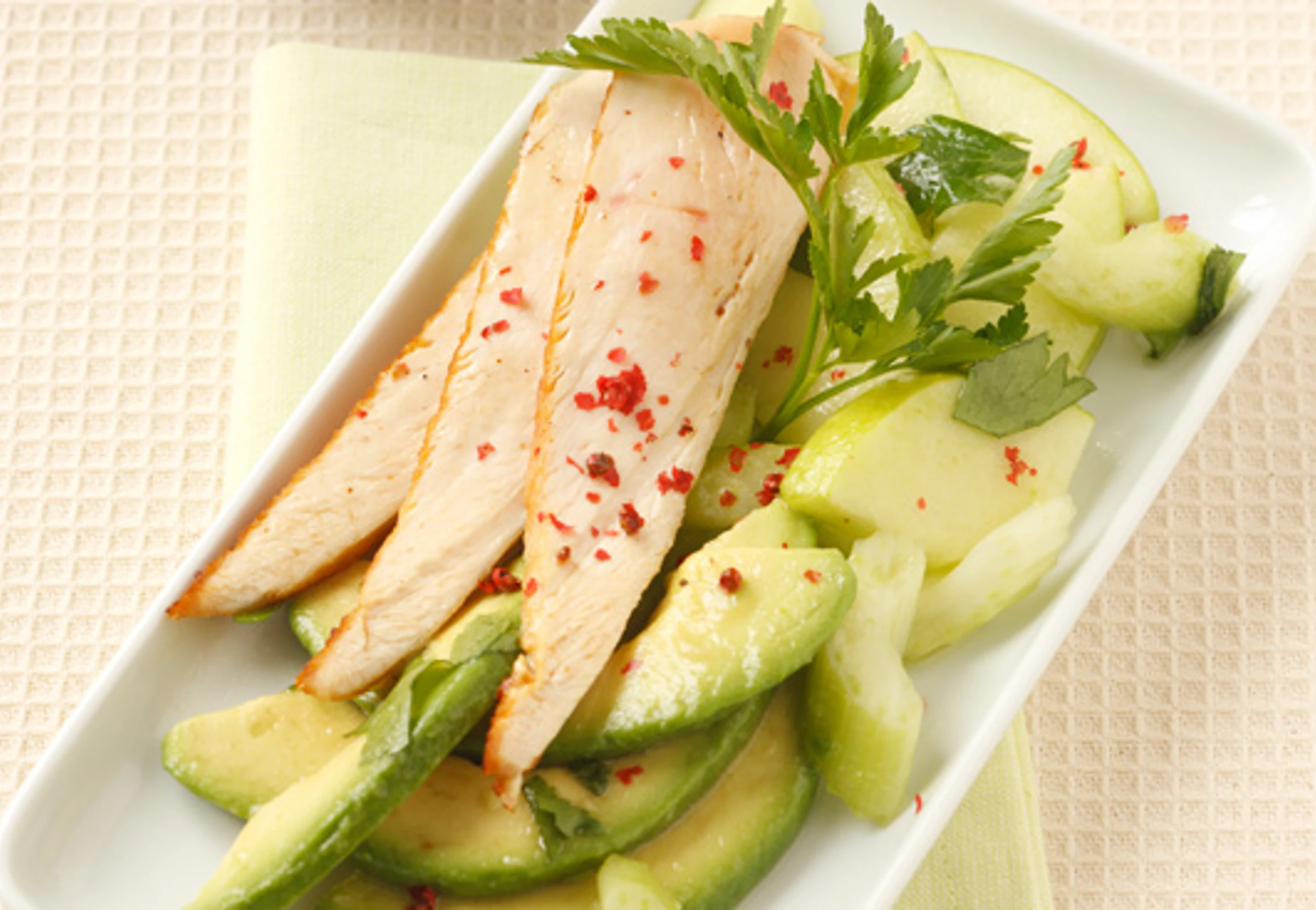 Sellerie schälen und quer in schräge Stücke schneiden. Vom Apfel das Kerngehäuse ausstechen. Apfel achteln und quer in Scheiben schneiden. Avocado halbieren und den Kern entfernen. Fruchtfleisch schälen und quer in Scheiben schneiden. Sellerie, Apfel, Avocado und Petersilie mit der Marinade vermischen.