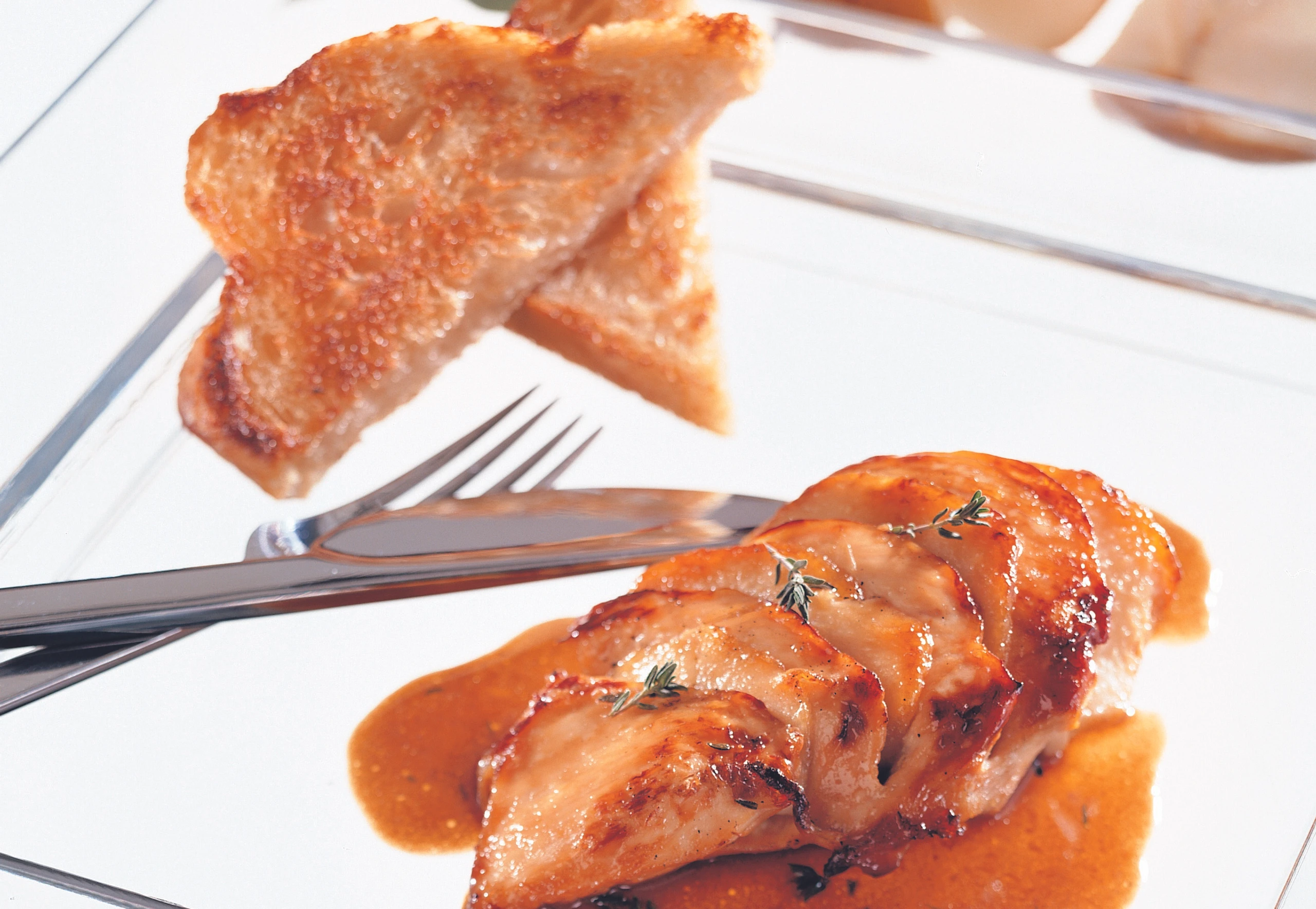 - Filets aus der Pfanne nehmen und warm stellen. Thymian entfernen. Bratrückstand mit Suppe aufgießen, Birnenstücke zugeben und aufkochen. Sauce umgießen und ca. 3 Minuten kochen. Butter zugeben, Sauce mit einem Stabmixer pürieren, salzen und pfeffern. Brote halbieren und toasten. Filets mit der Sauce anrichten und mit den Toasts servieren.