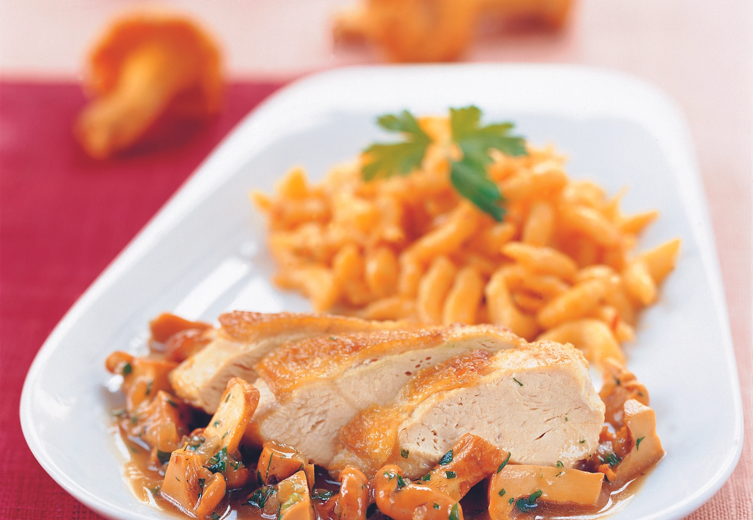 Im Bratrückstand Butter erhitzen. Schwammerl und Zwiebel darin anrösten, mit Salz, Pfeffer und zerdrücktem Knoblauch würzen. Suppe zugießen und aufkochen. Sauce ca. 1 Minute schwach köcheln. Petersilie einrühren. Filets mit Sauce und Spätzle anrichten.