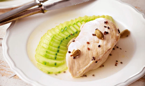 - Gurke aus der Marinade nehmen und in dünne Scheiben schneiden. Haut von den Hühnerfilets abziehen. Fleisch und Gurke mit dem Kardamomfond servieren.