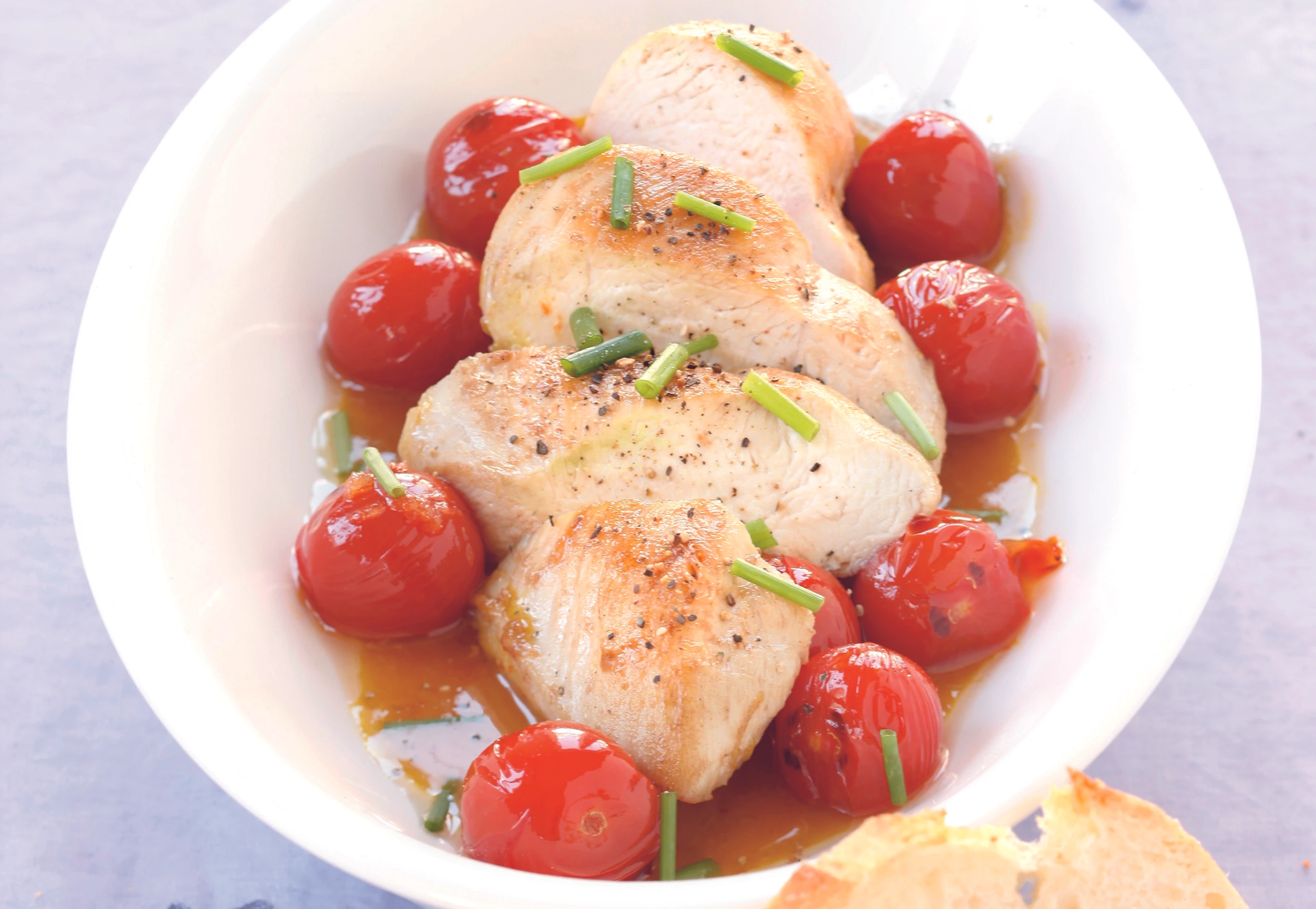 Im Bratrückstand Paradeiser anbraten, mit Zucker bestreuen, ca. 1 Minute garen und aus der Pfanne nehmen. Suppe in die Pfanne gießen, Safran einrühren und kurz köcheln. Paradeiser zugeben, salzen und pfeffern. Filets mit Paradeisern anrichten und mit Schnittlauch bestreuen. Dazu passt Ciabatta.