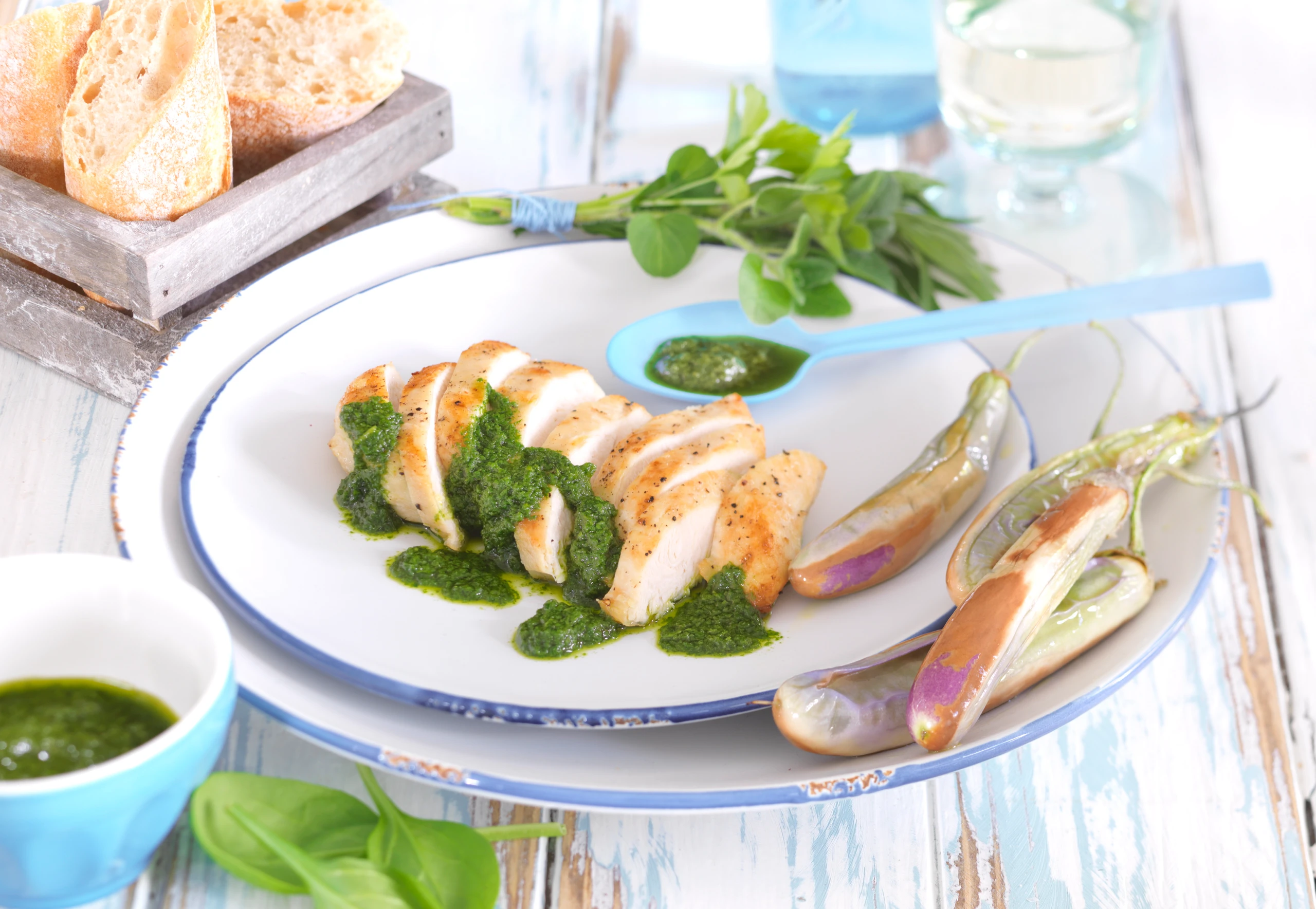 Für die Sauce Kräuterblättchen abzupfen und grob schneiden, Knoblauch schälen und grob hacken. Kräuter, Knoblauch, Pignoli und Olivenöl in einem Kutter fein mixen, mit Salz abschmecken.