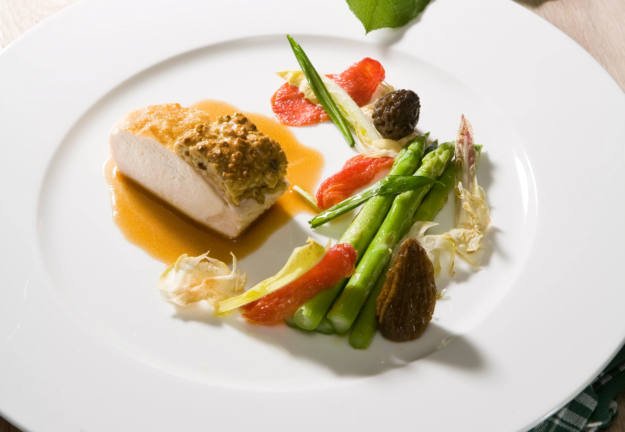 - Spargel im unteren Drittel schälen und die trockenen Enden wegschneiden. Spargel in 2 EL Olivenöl leicht anschwitzen. Mit Noilly Prat, Weißwein und Hühnersuppe aufgießen, mit Salz und Pfeffer abschmecken. Morcheln zugeben und mit dem Spargel weich dünsten. Kurz vor Ende der Garzeit Paradeiser zugeben.