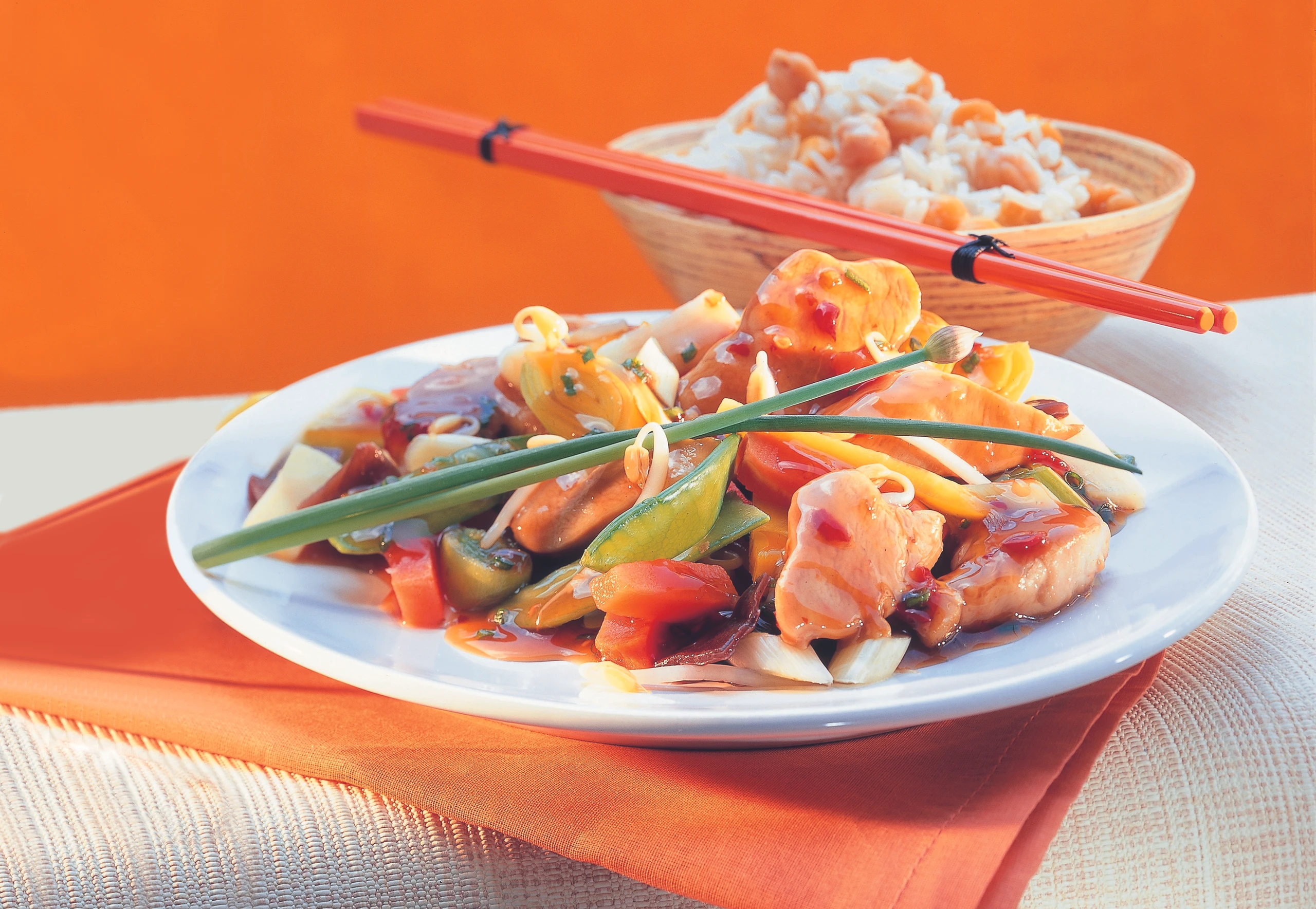 - Wok-Gemüse im Bratrückstand laut Packungsanweisung zubereiten. Hühnerfilets untermischen, mit Schnittlauch bestreuen und mit Reis auf vorgewärmten Tellern anrichten.