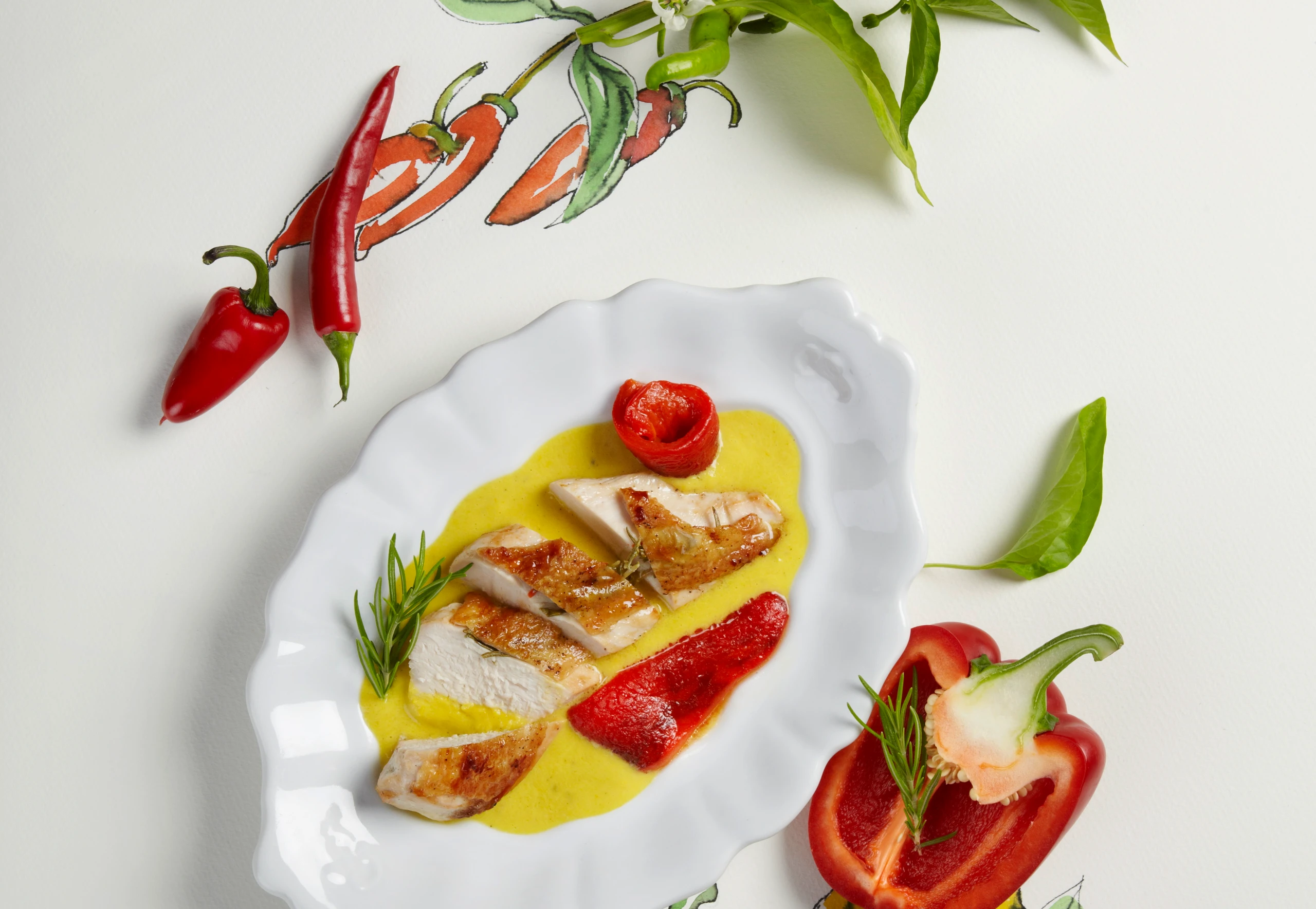 Von den roten Paprika Haut abziehen, Strunk und Kerngehäuse entfernen. Paprika in 3 cm breite Streifen schneiden. Für die Marinade Essig mit Salz und Pfeffer vermischen, Öl einrühren. Paprika mit der Marinade vermischen. Hühnerfilets mit Paprikacreme und Paprikastreifen servieren.