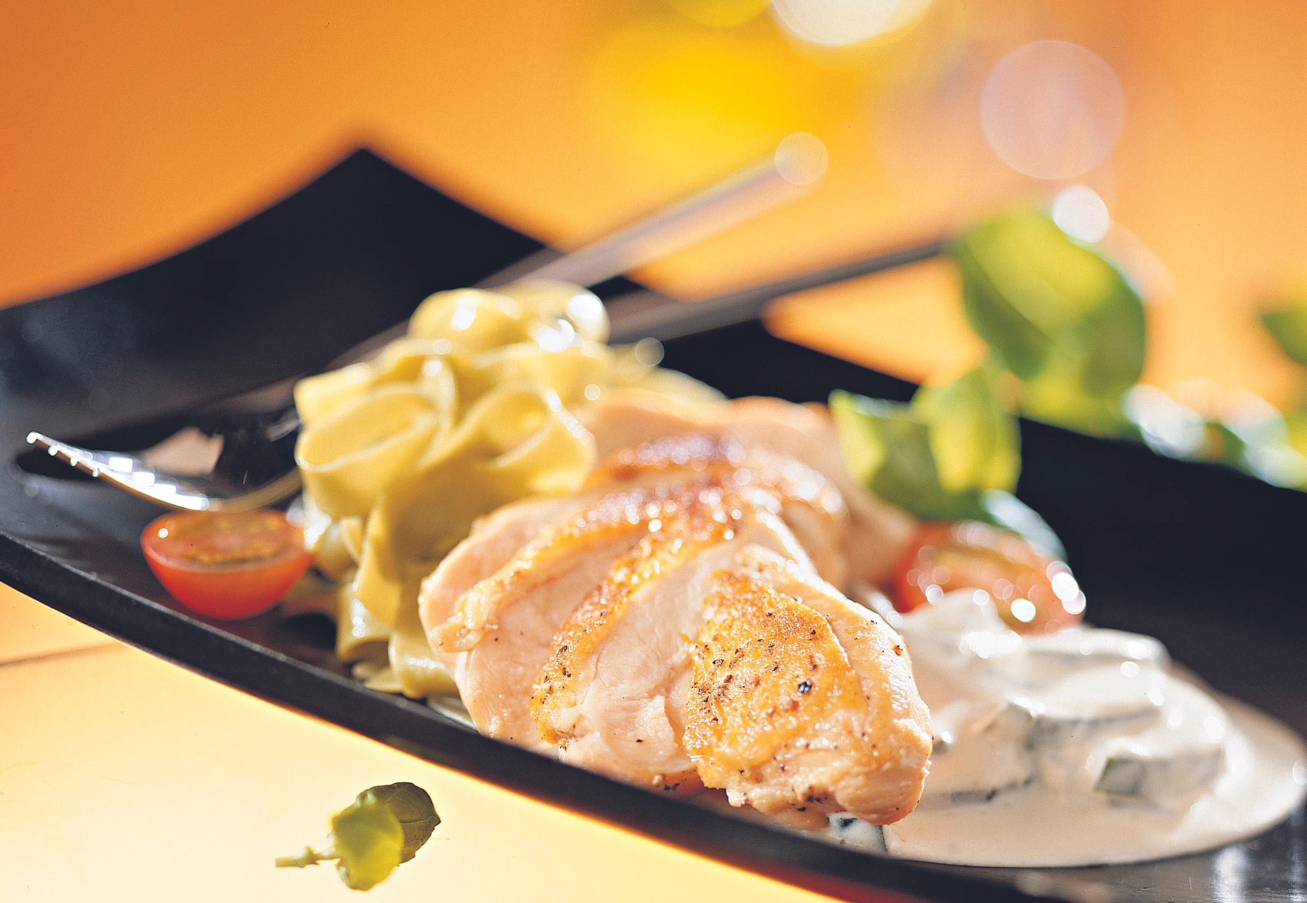 Hühnerfilets salzen, pfeffern, im Öl bei schwacher Hitze beidseitig braten (je nach Dicke auf jeder Seite ca. 4 Minuten, Hautseite zuerst) – dabei immer wieder mit Bratfett übergießen. Fleisch aus der Pfanne nehmen und warm stellen.