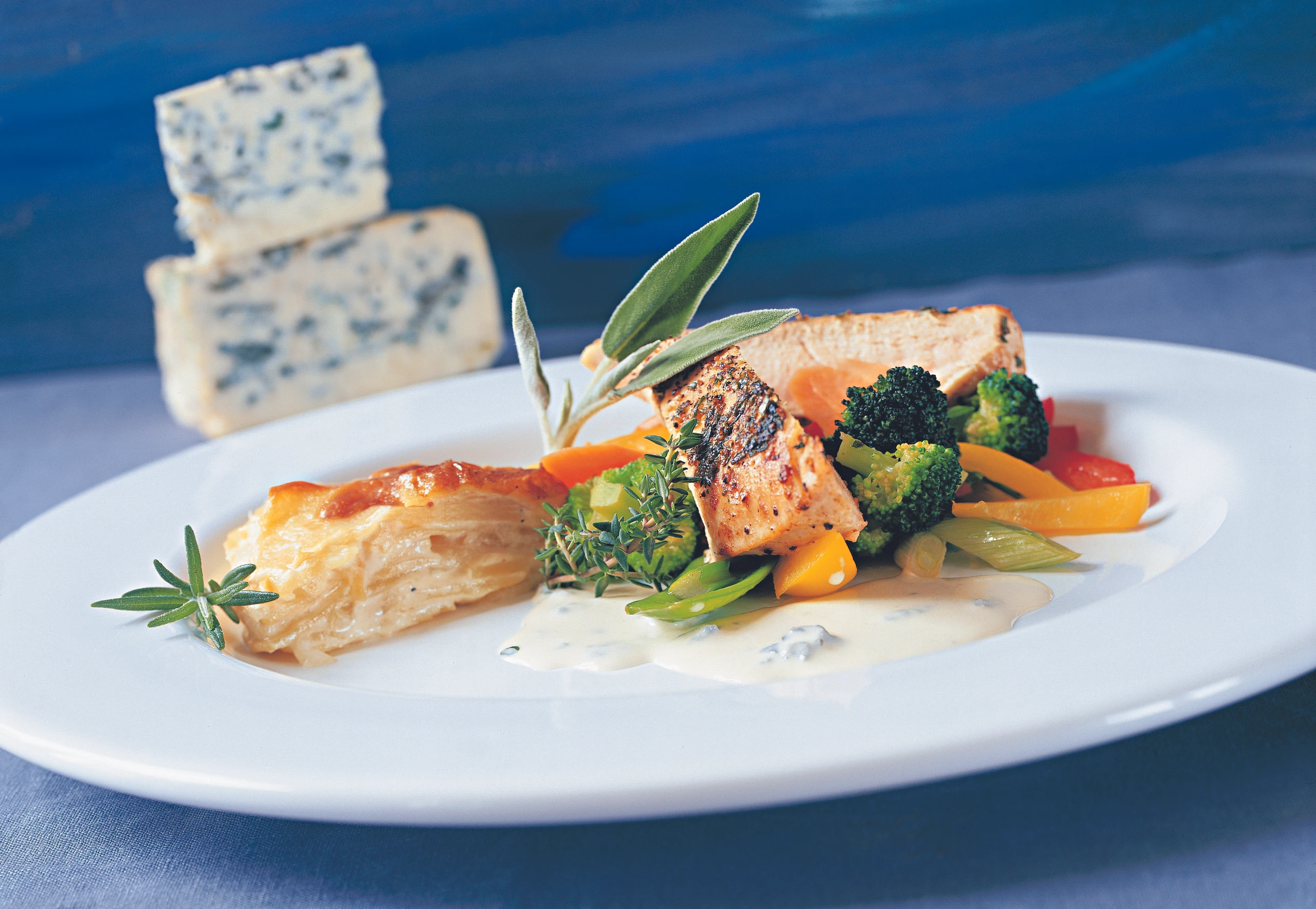 Hühnerfilets mit Edelschimmelkäsesauce und glaciertem Gemüse