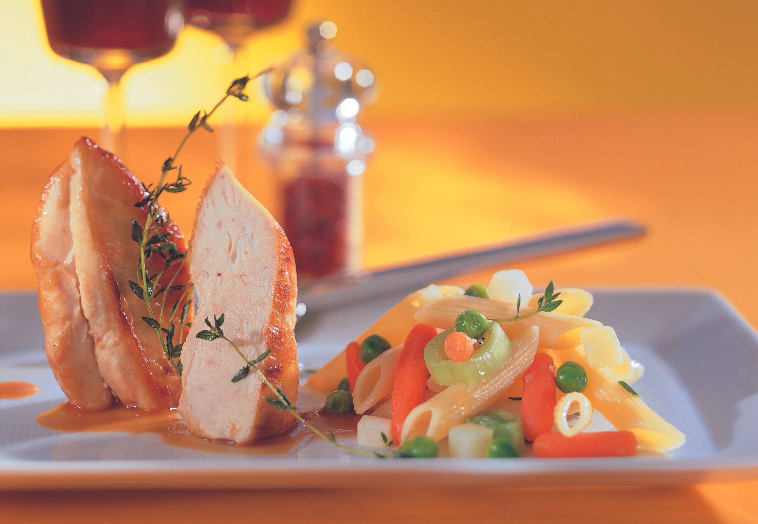 Parallel dazu Teigwaren in Salzwasser bissfest kochen, abseihen und abtropfen lassen. Gemüse in Butter anschwitzen, mit Wein ablöschen, mit Salz, Pfeffer, Thymian und zerdrücktem Knoblauch würzen. Gemüse zudecken und bissfest dünsten. Penne untermischen.