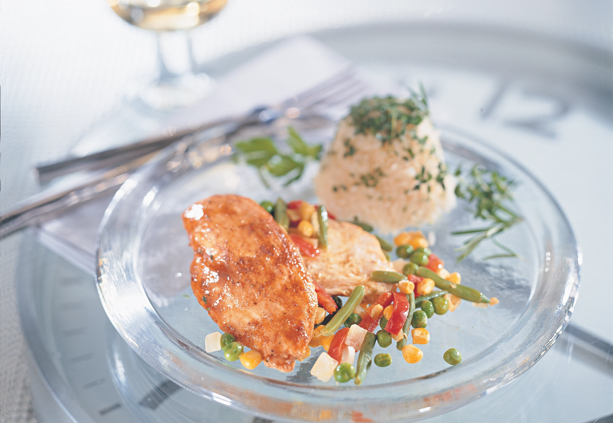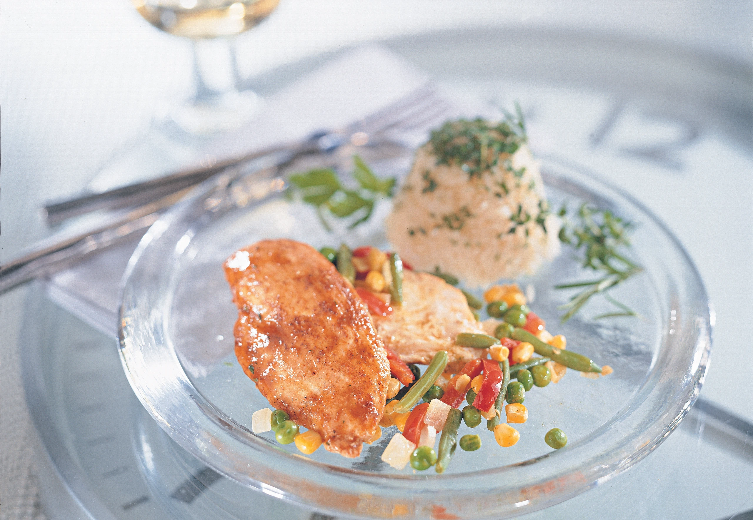 Hühnerfilets durchschneiden, mit Gemüse und Reis anrichten, mit dem entstandenen Bratensaft beträufeln.