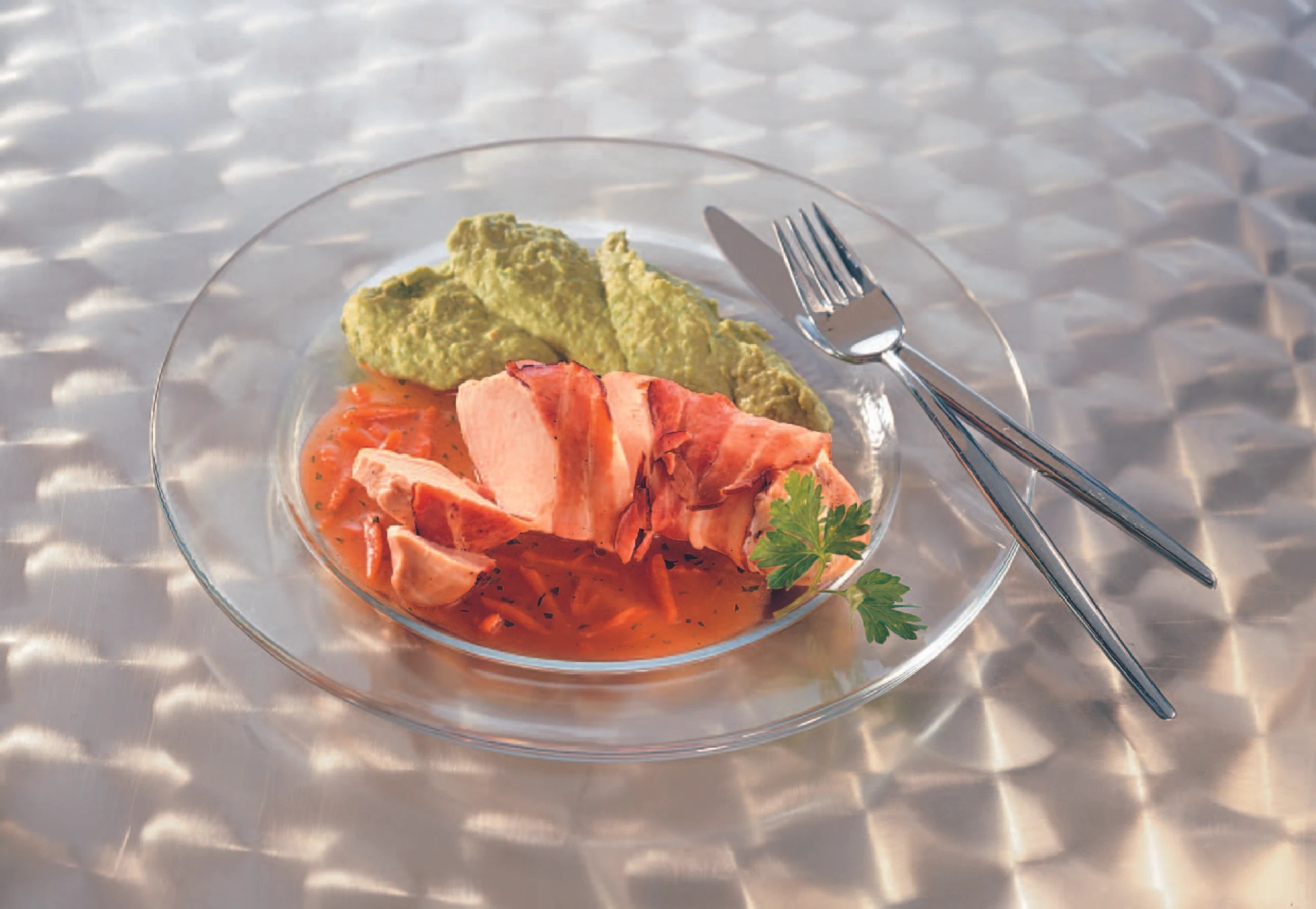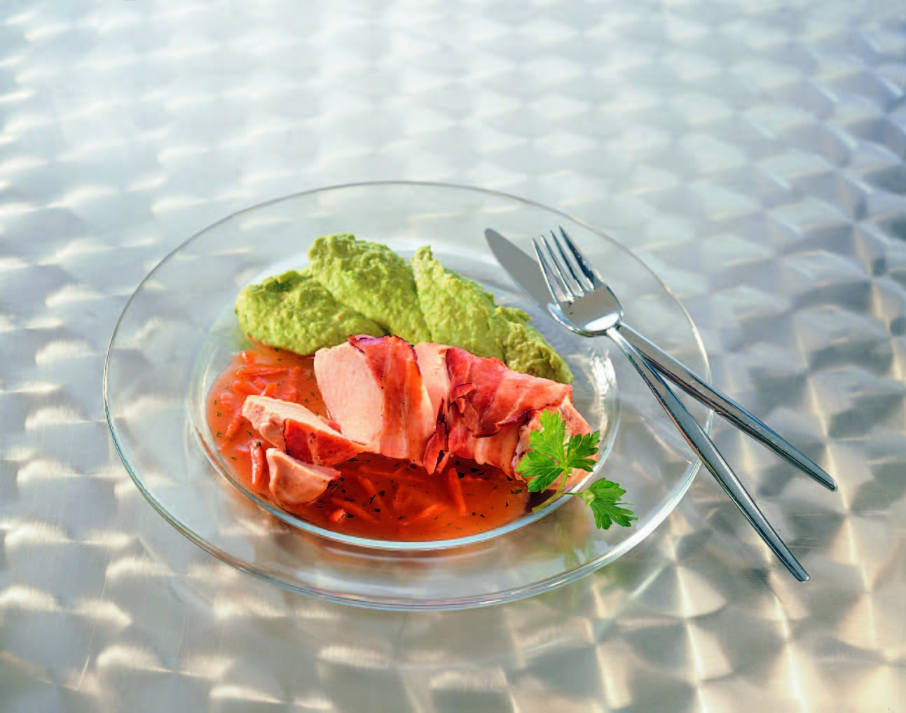 Backrohr auf 50 °C vorheizen. Hühnerfilets salzen und pfeffern, jedes Filet mit 2 Speckscheiben eng umwickeln. Speck mit Zahnstochern fixieren. Karotte schälen und grob raspeln.