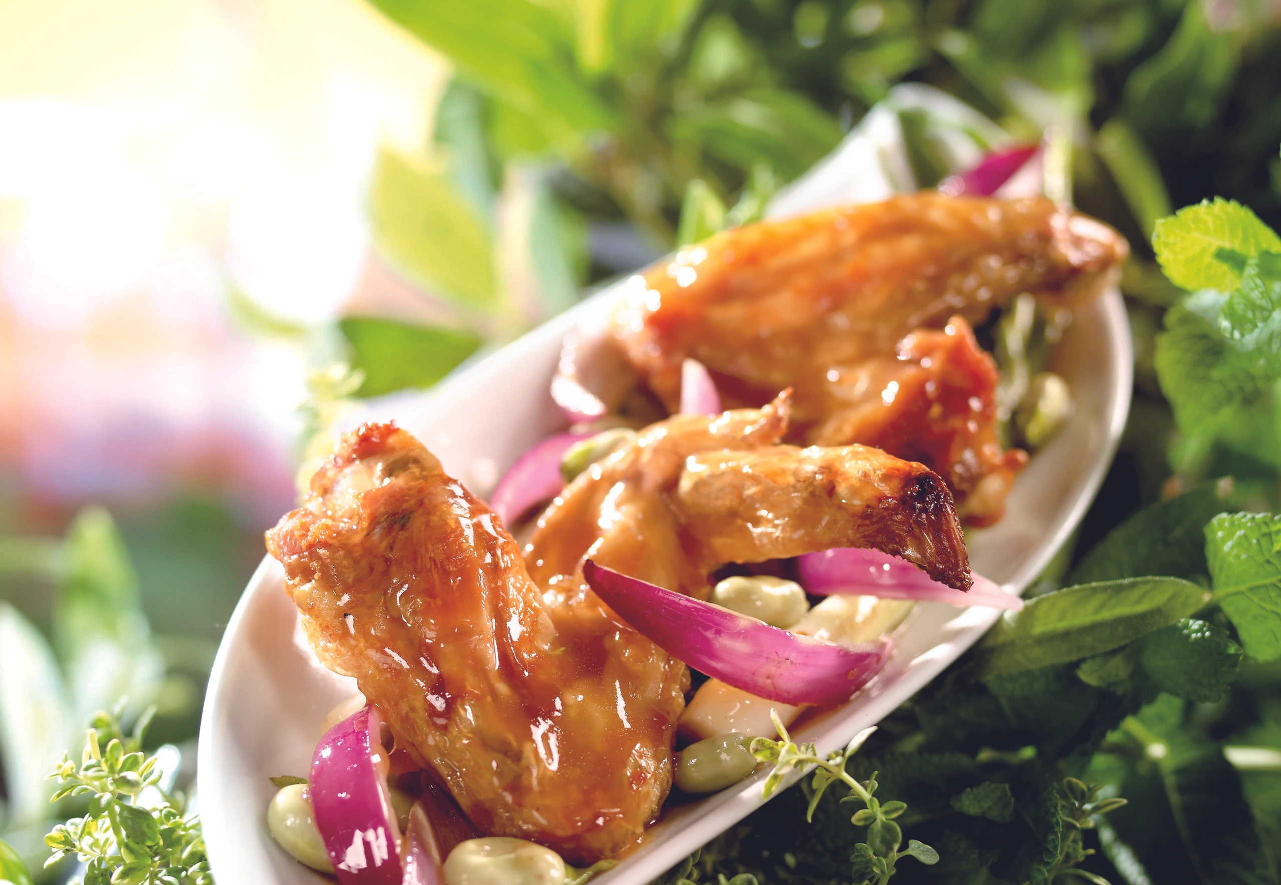 - Im Bratrückstand rote Zwiebeln, Jungzwiebeln und Saubohnen kurz anrösten, mit Suppe und Austernsauce ablöschen und aufkochen. Chilis und Minze entfernen, Sauce eventuell salzen und pfeffern. Flügerln untermischen, erwärmen und mit der Sauce servieren.